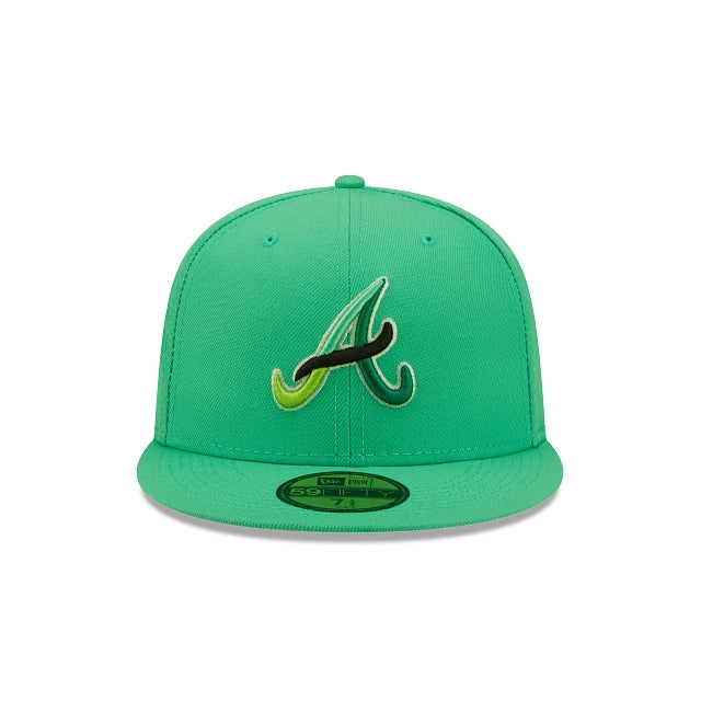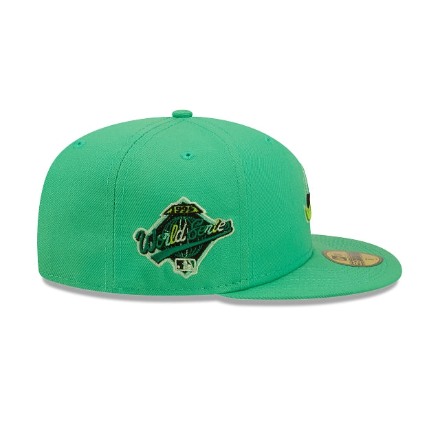 The Atlanta Braves Snakeskin 59FIFTY Fitted Cap features an embroidered Braves multi-colored logo at the front panels, a 1995 World Series patch at the right-wear side, and a matching MLB Batterman logo at the rear. Additional details include a snakeskin inspired inner sweatband and green undervisor.