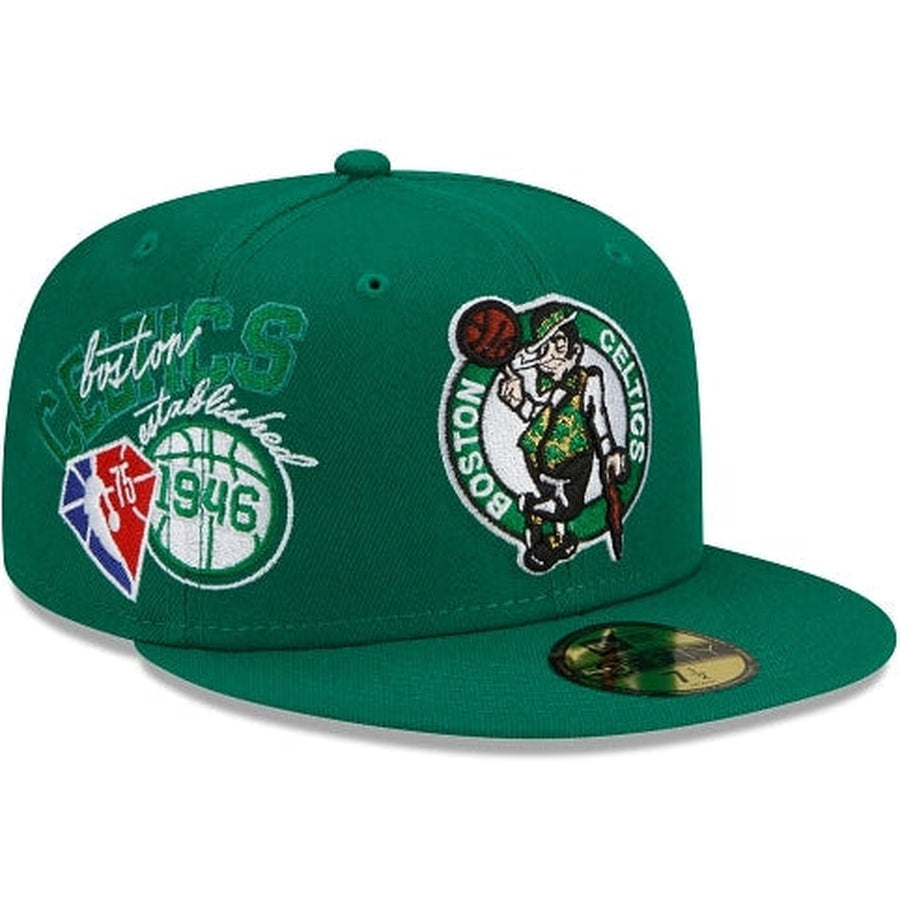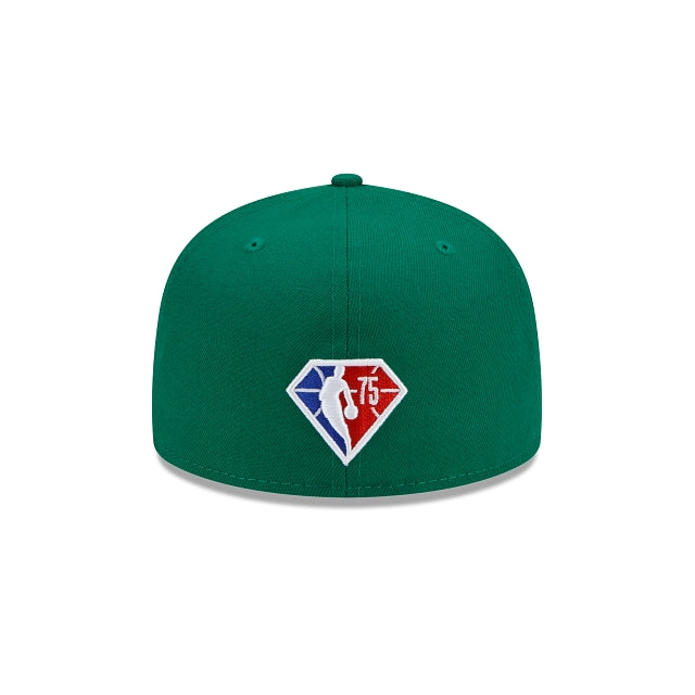 The push for the playoffs starts with this year's NBA Back Half Collection. The Boston Celtics Back Half 59FIFTY Fitted Cap features an embroidered Celtics logo at the front panels with team and league specific embroidered artwork at the right-wear side extending to the front panels, and the NBA 75th anniversary logo embroidered at the rear.