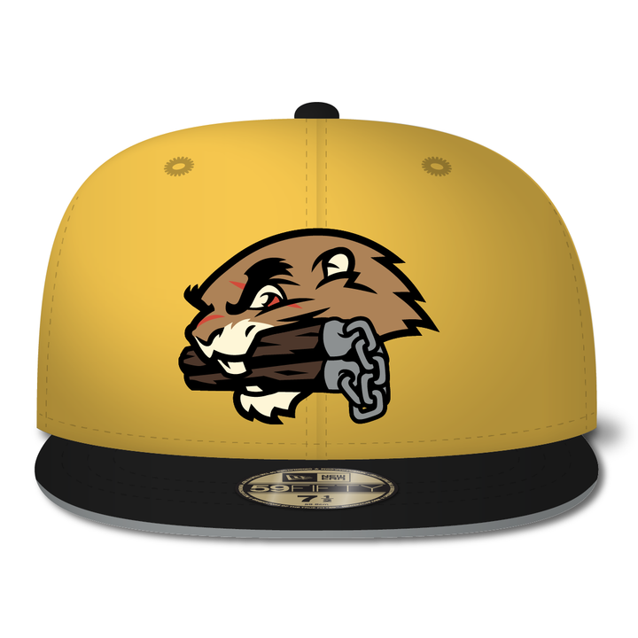 The New Era Goodchucks 59FIFTY Fitted Hat has been designed by 40swords. "Numbchucks" were popularized in kung fu and ninja flicks of the 80s, and of course every kid wanted to be bad-ass with them...Now as adults we need to find a more reasonable way to enjoy, so why not on a cap? Inspired by the great Bruce Lee in Game of Death, this here rodent makes his own nunchaku - and will put the hurt on any turtle that wants that smoke!