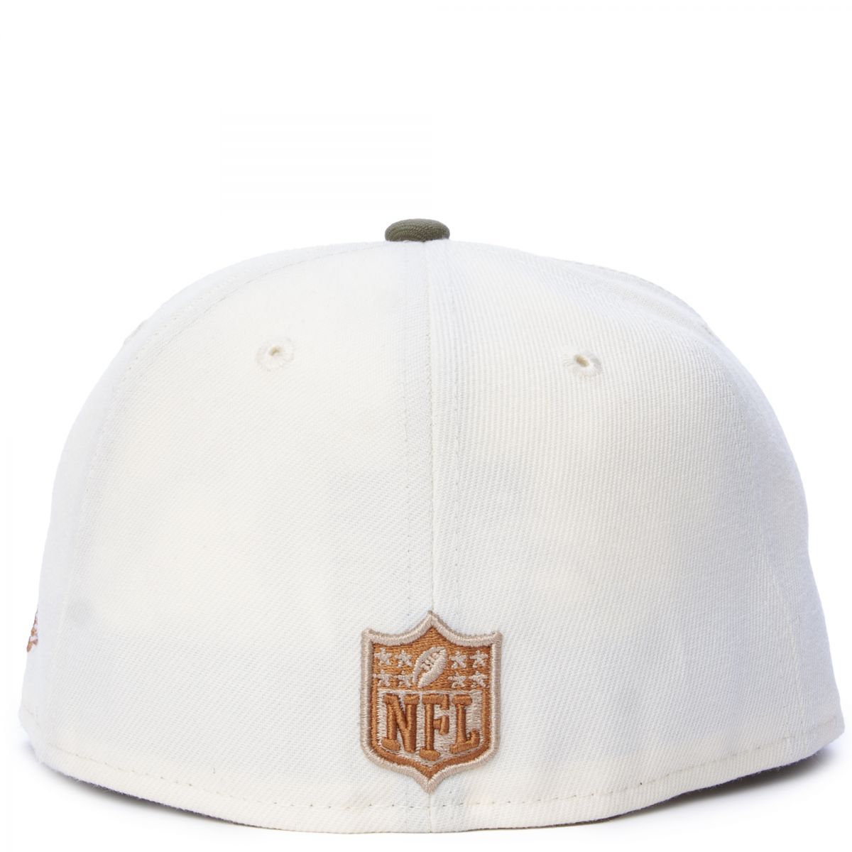 This New Era Las Vegas Raiders 59FIFTY fitted hat has a chrome six panel structured high crown and embroidered eyelets with an olive green fabric squatchee button and flat bill. The undervisor of the fitted is peanut brown with a black sweatband. The front panel include the Las Vegas Raiders logo embroidery.