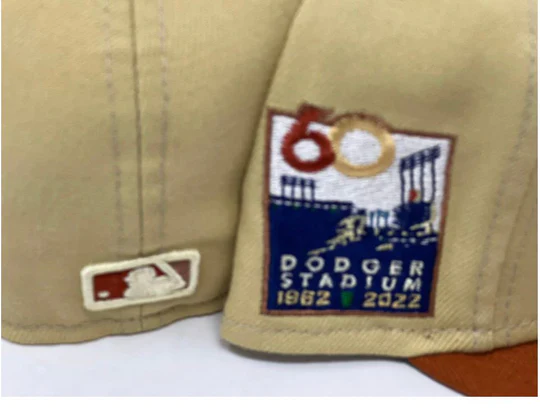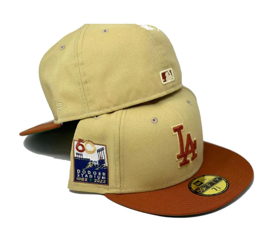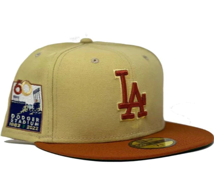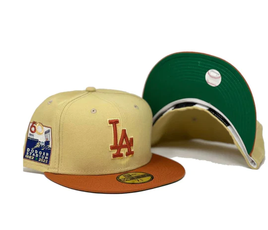 This New Era LA Dodgers 60th Anniversary “Vegas Gold” 59FIFTY fitted hat is a Sports World 165 exclusive release. The fitted has a vegas gold six panel construction with a kelly green undervisor and white sweatband. The front panel features the Los Angeles Dodgers logo embroidered in rust orange stitching with a 60th Anniversary side patch on the right panel.