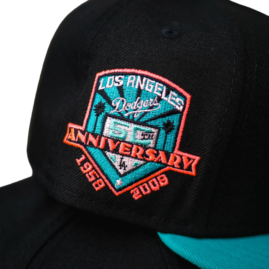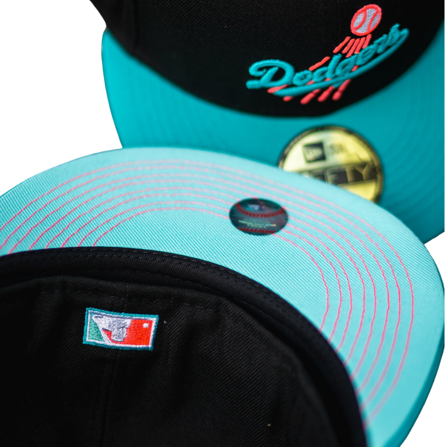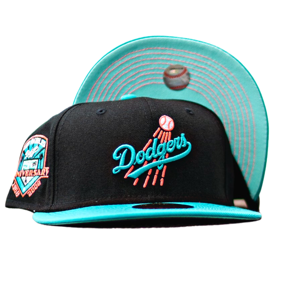 This New Era Los Angeles Dodgers Black/Teal 60th Anniversary Mint UV 59FIFTY Fitted Hat was released by Sneaker Town. The fitted has a black six panel structured high crown and embroidered eyelets with a teal fabric squatchee button and flat bill. The fitted cap has a mint bottom undervisor with a black sweatband . The front panel features the Los Angeles Dodgers logo embroidery and a side patch embroidered on the right panel. The left panel of the fitted displays the New Era logo and the official MLB logo embroidery on the rear crown.