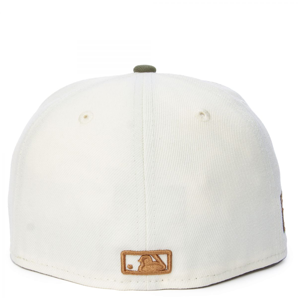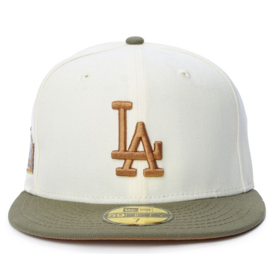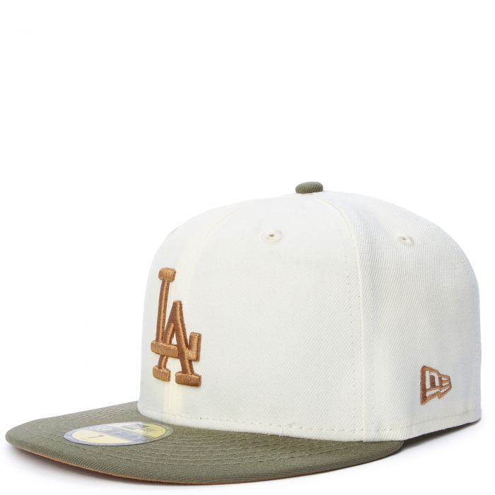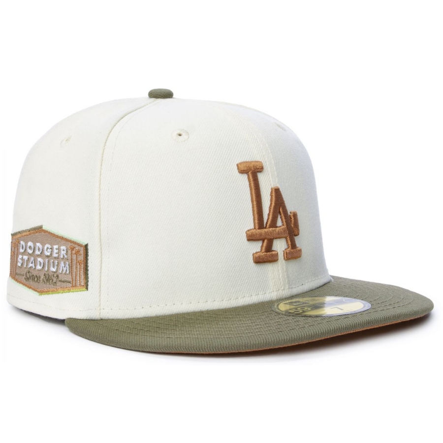 This New Era Los Angeles Dodgers 59FIFTY fitted hat has a chrome six panel structured high crown and embroidered eyelets with an olive green fabric squatchee button and flat bill. The undervisor of the fitted is peanut brown with a black sweatband. The front panel include the LA Dodgers logo embroidery and a Dodger Stadium side patch on the right-wear side.