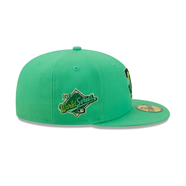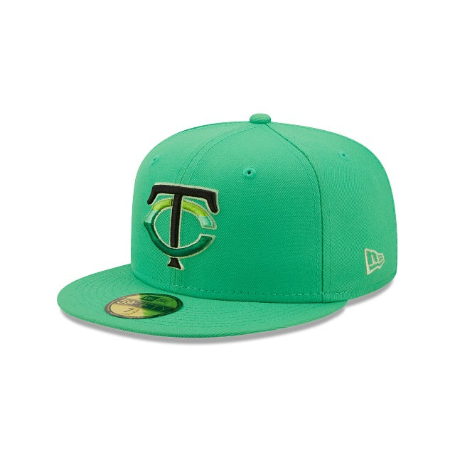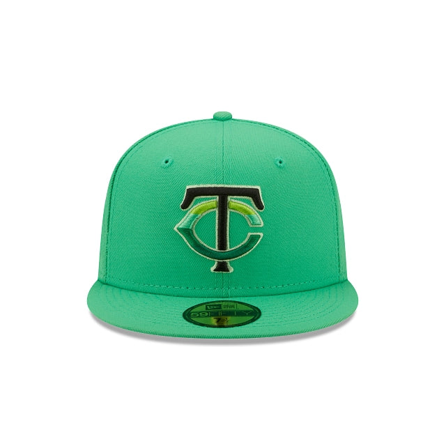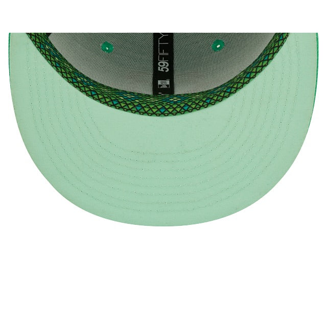The Minnesota Twins Snakeskin 59FIFTY Fitted Cap features an embroidered Twins multi-colored logo at the front panels, a 1987 World Series patch at the right-wear side, and a matching MLB Batterman logo at the rear. Additional details include a snakeskin inspired inner sweatband and green undervisor.
