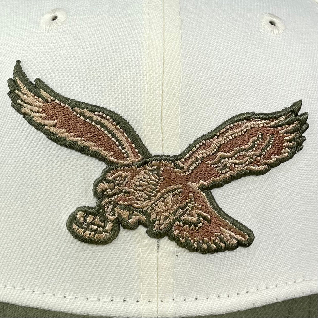 This New Era Philadelphia Eagles Chrome/Olive Established 1933 59FIFTY Fitted Hat is a Fan Treasures exclusive. The fitted has a chrome six panel structured high crown and embroidered eyelets with a olive green fabric squatchee button. The flat bill of the fitted is olive green with a light bronze undervisor. The front panel features the Philadelphia Eagles logo embroidery and a Established 1933 side patch embroidery on the right panel. The left panel of the fitted displays the New Era logo and the official NFL embroidery on the rear crown.