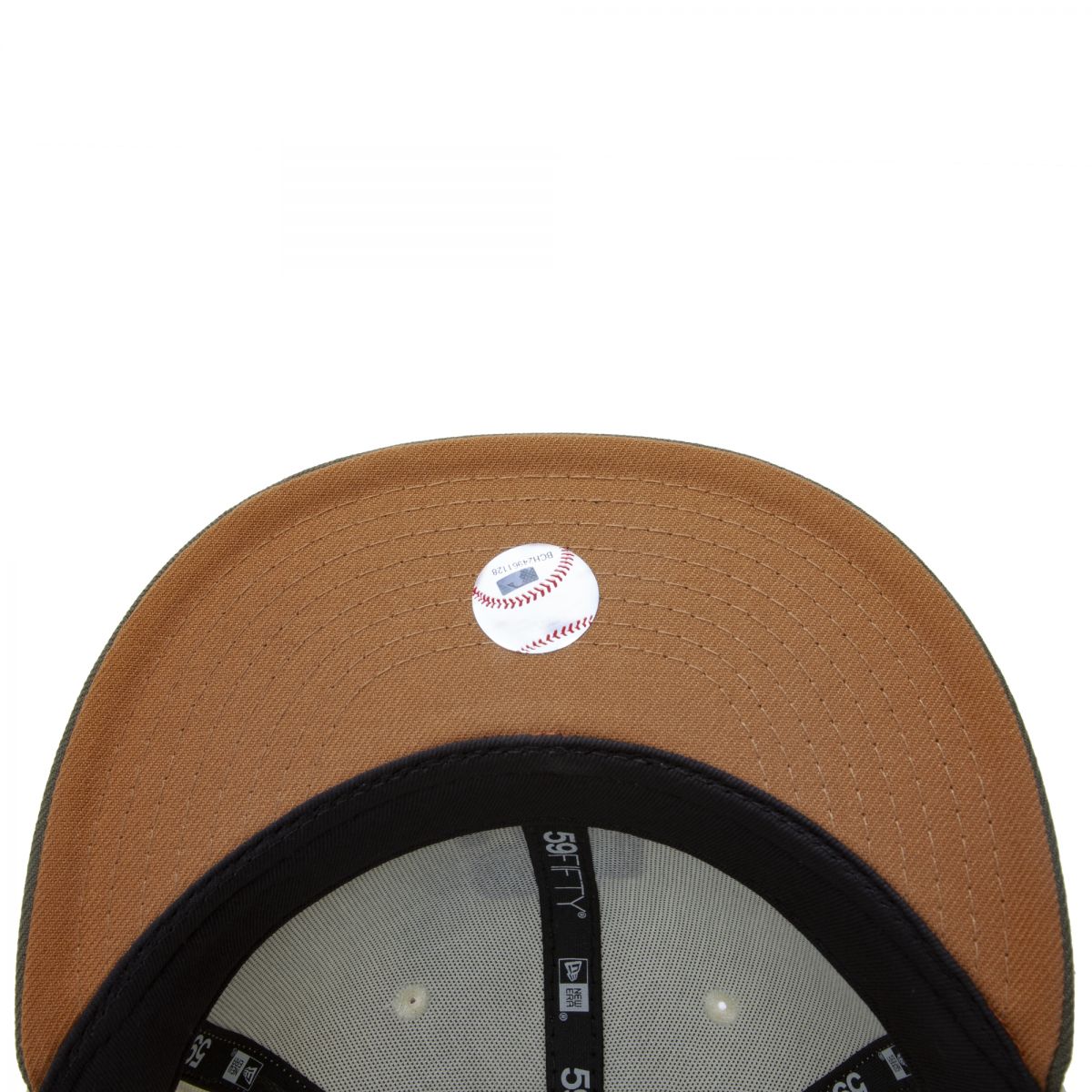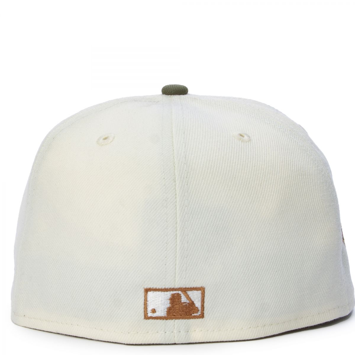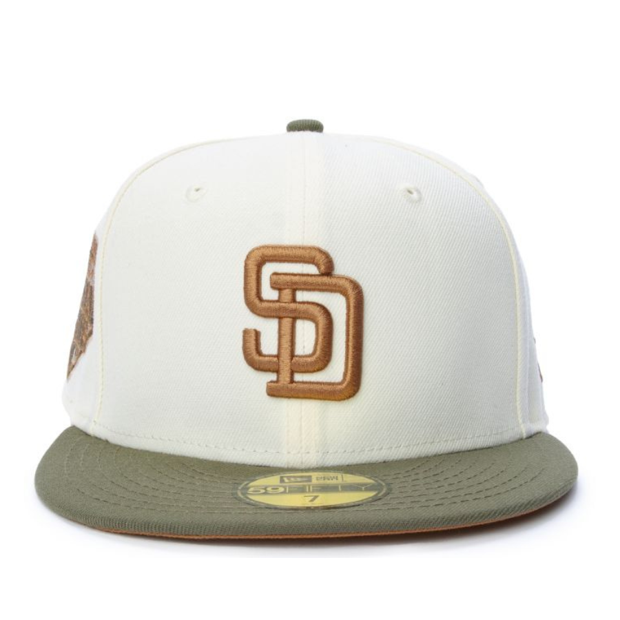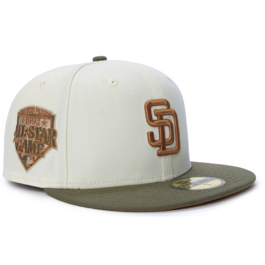 This New Era San Diego Padres 1992 All-Star Game 59FIFTY fitted hat has a chrome six panel structured high crown and embroidered eyelets with an olive green fabric squatchee button and flat bill. The undervisor of the fitted is peanut brown with a black sweatband. The front panel include the SD Padres logo embroidery and a 1992 ASG side patch on the right-wear side.