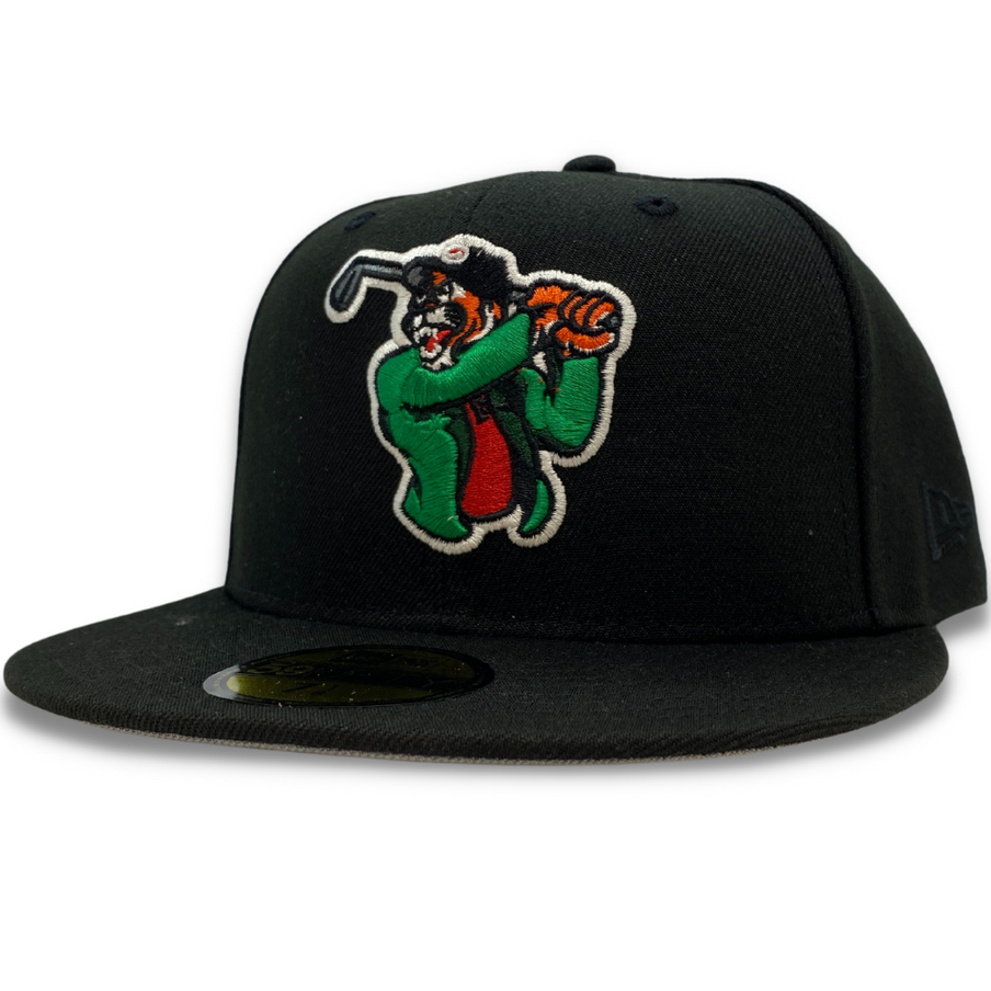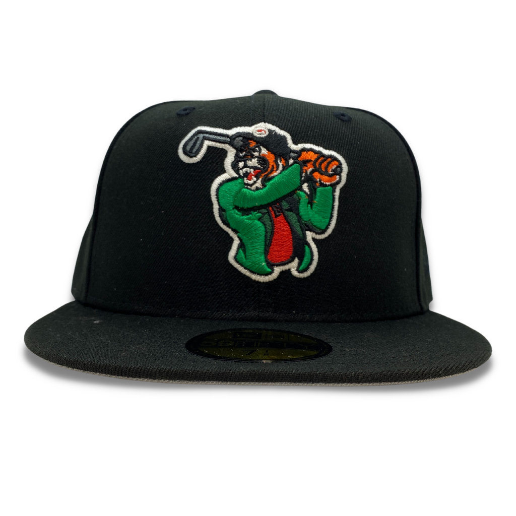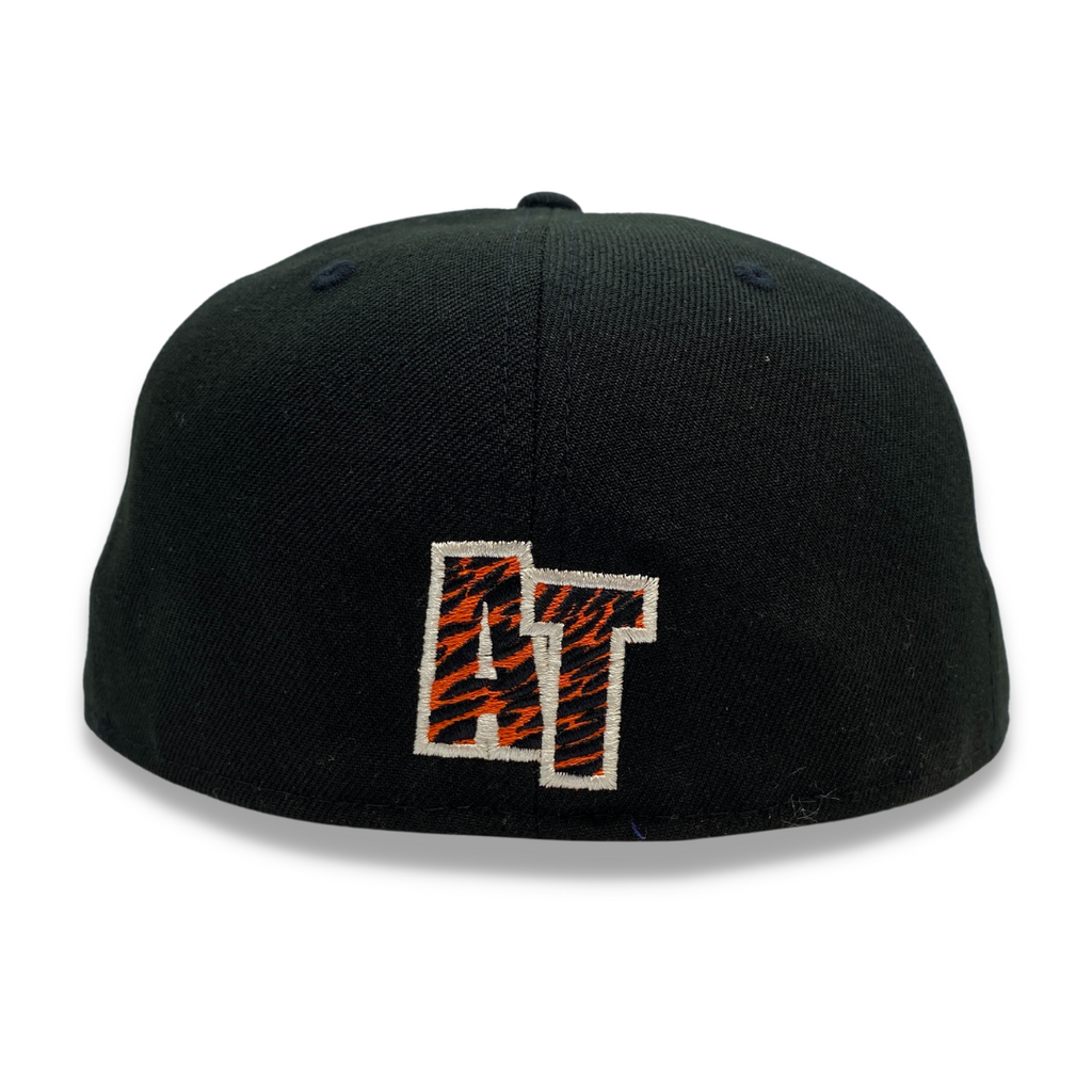 This New Era Augusta Tigers 59FIFTY fitted hat was released by Source Teamworks. The fitted has a black six panel structured high crown, embroidered eyelets, fabric squatchee button and flat bill. The front panel includes the Augusta Tigers logo embroidered in orange and green stitching.