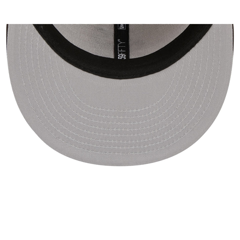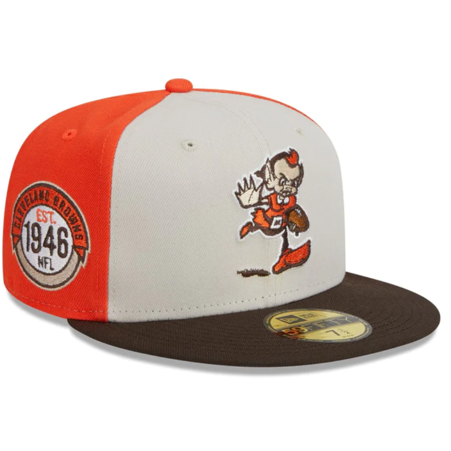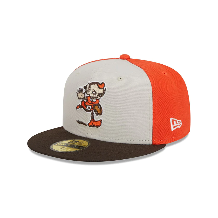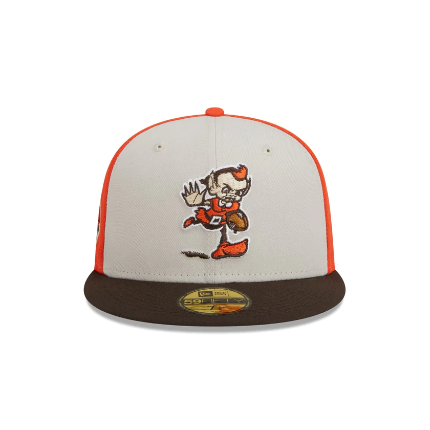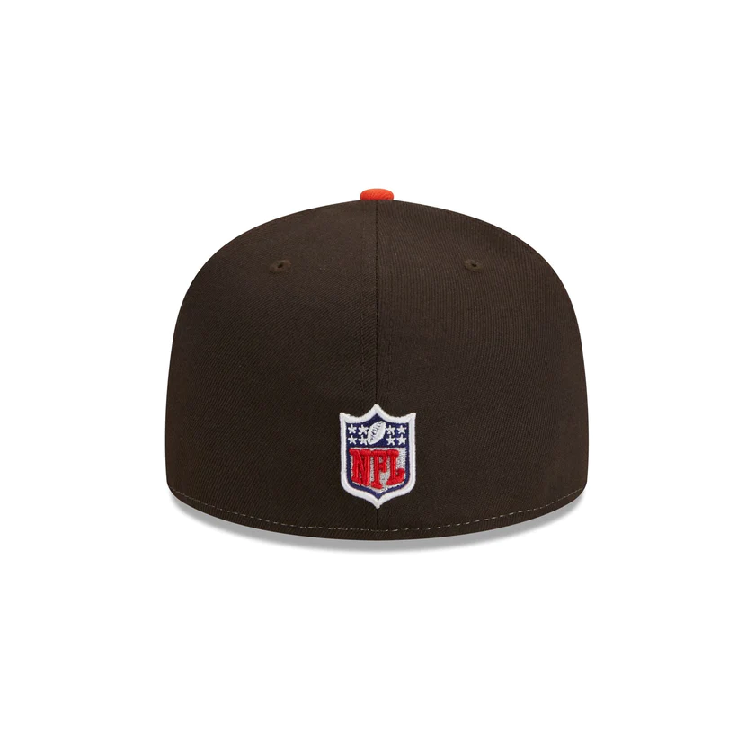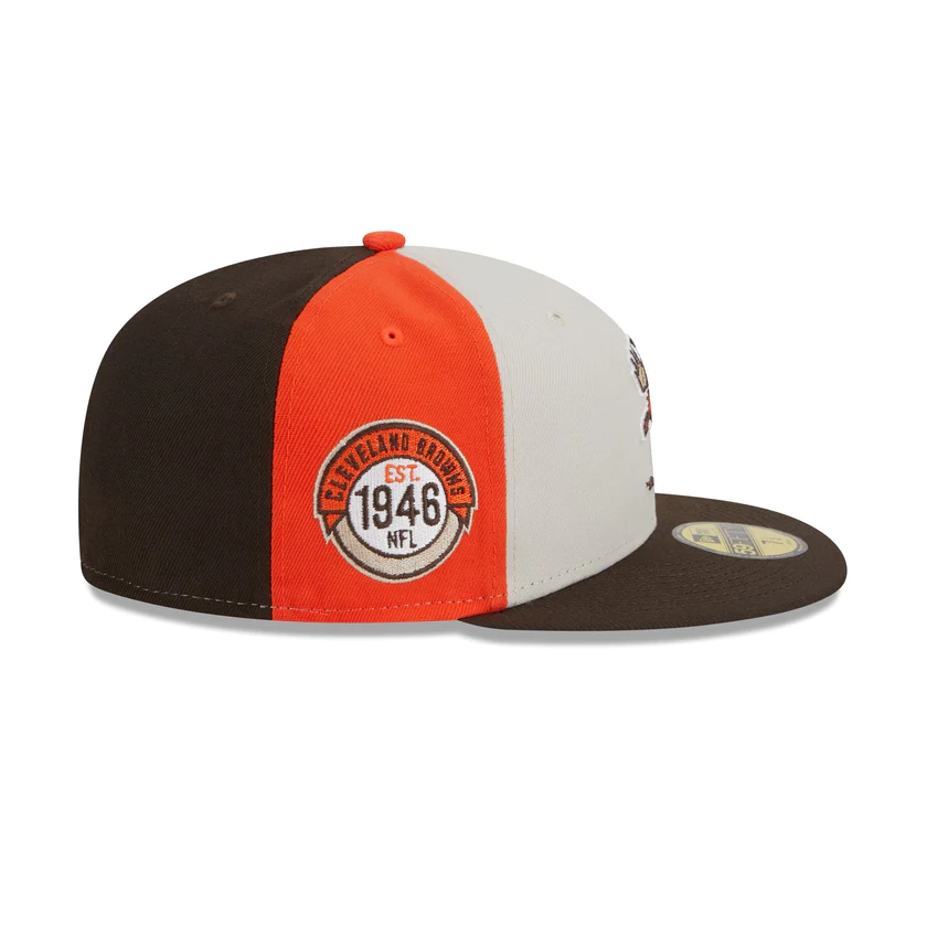 The Cleveland Browns 2023 Sideline Historic 59FIFTY Fitted Cap features an embroidered Browns historic logo at the front panels with a matching NFL Shield at the rear. Additional details include a patch with the team's established year at the right-wear side and a gray undervisor.