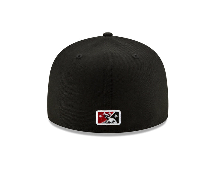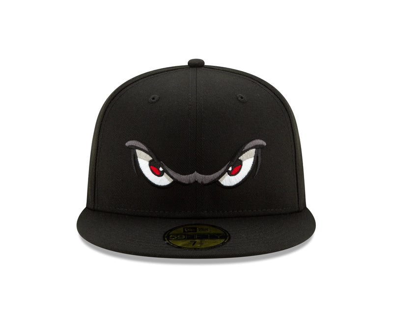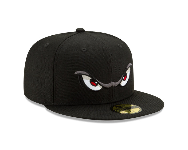 This Lake Elsinore Storm has an all black six panel structured high crown and embroidered eyelets with a black fabric squatchee button. The fitted cap also has a black flat bill. The front panel features the Lake Elsinore Storm eyes logo embroidery. The left panel of the fitted displays the New Era logo and the official MiLB Batterman logo embroidery on the rear crown.