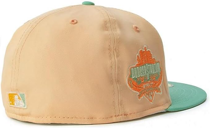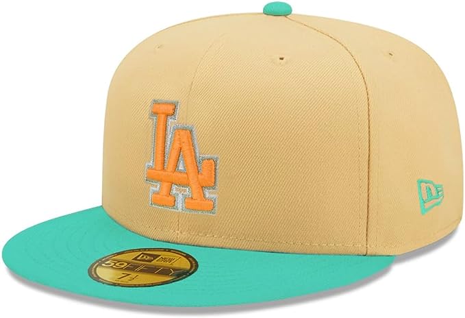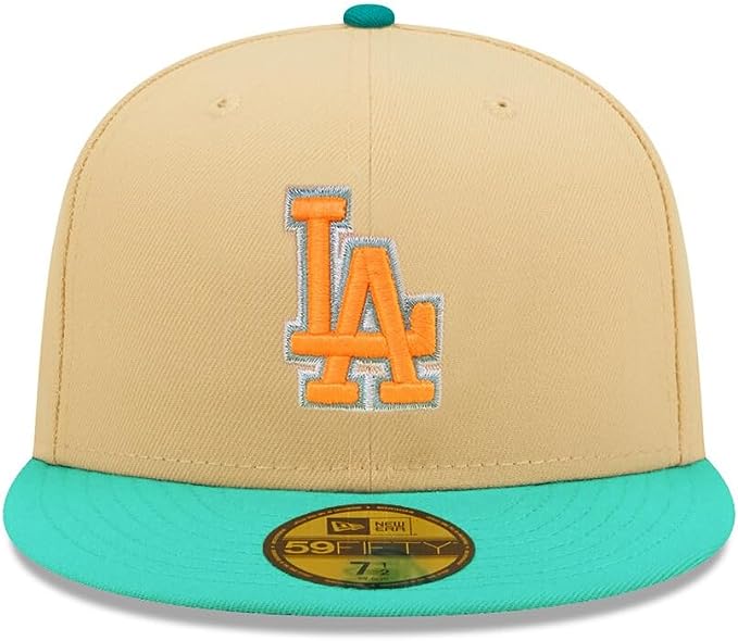 This Los Angeles Dodgers fitted hat has a peach six panel structured high crown and embroidered eyelets with a teal fabric squatchee button. The fitted cap also has a teal flat bill with a grey undervisor and white sweatband. The front panel features the LA Dodgers logo embroidery and a 50th Anniversary side patch embroidery on the right panel. The left panel of the fitted displays the New Era logo and the official MLB Batterman logo embroidery on the rear crown.