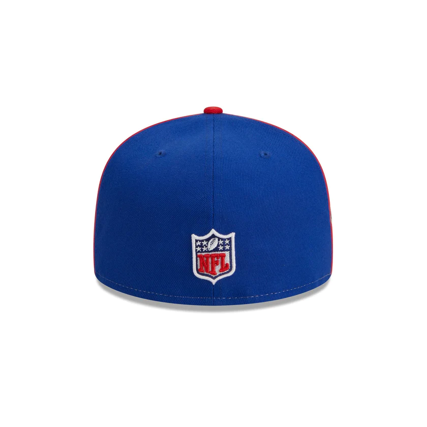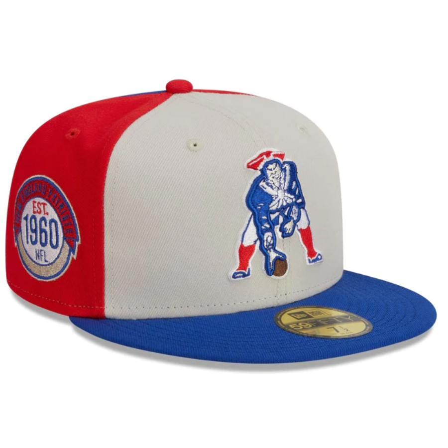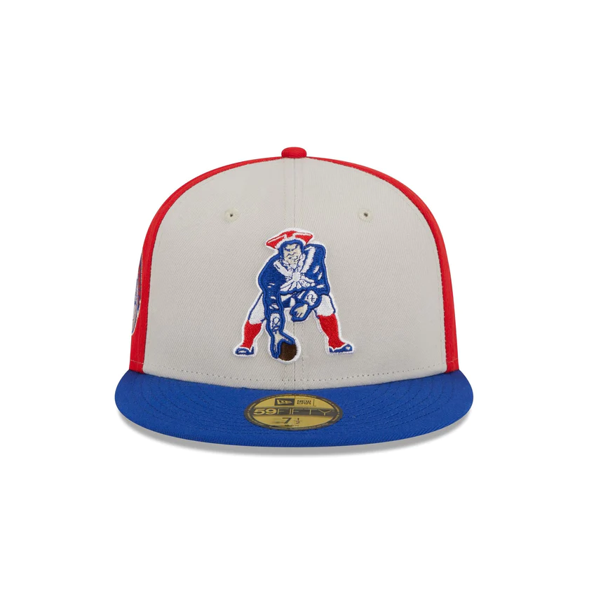 The New England Patriots 2023 Sideline Historic 59FIFTY Fitted Cap features an embroidered Patriots historic logo at the front panels with a matching NFL Shield at the rear. Additional details include a patch with the team's established year at the right-wear side and a gray undervisor.