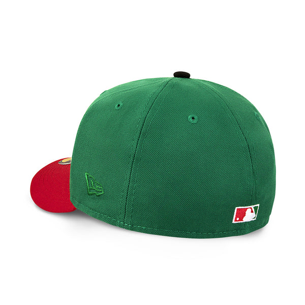 This St. Louis Cardinals fitted hat was released by Cap USA NYC. The fitted has a green six panel structured high crown and embroidered eyelets with a black fabric squatchee button. The fitted cap also has a red flat bill. The front panel features the St. Louis Cardinals logo embroidery a side patch on the right panel.