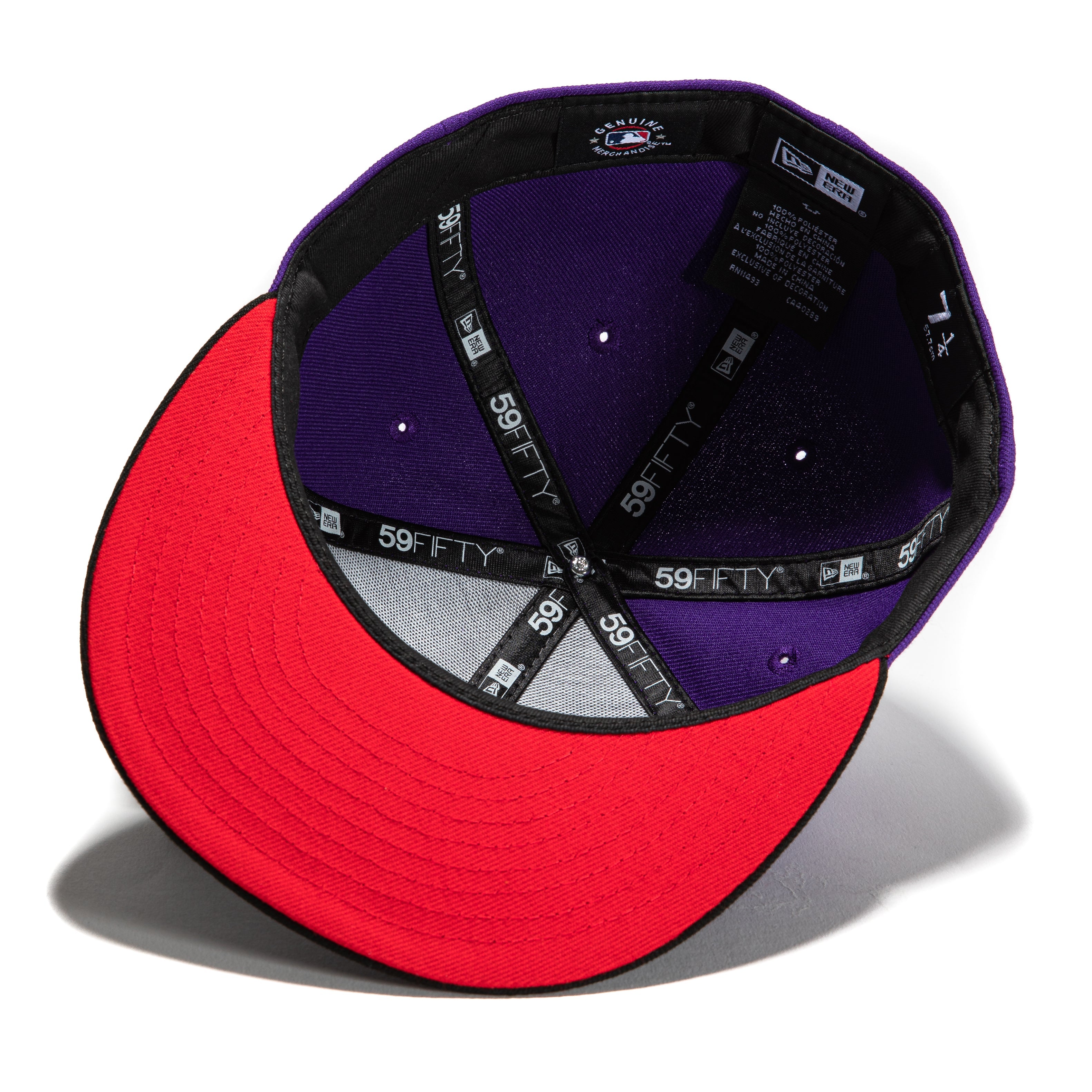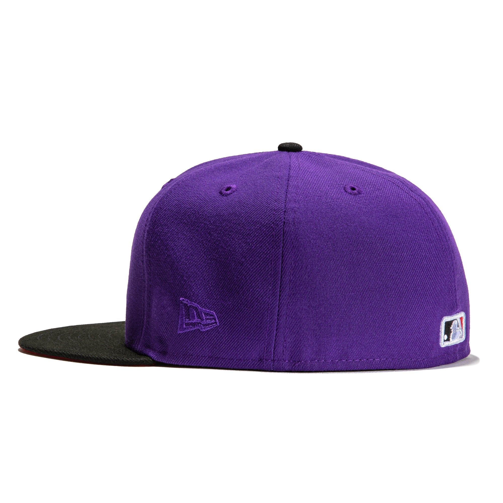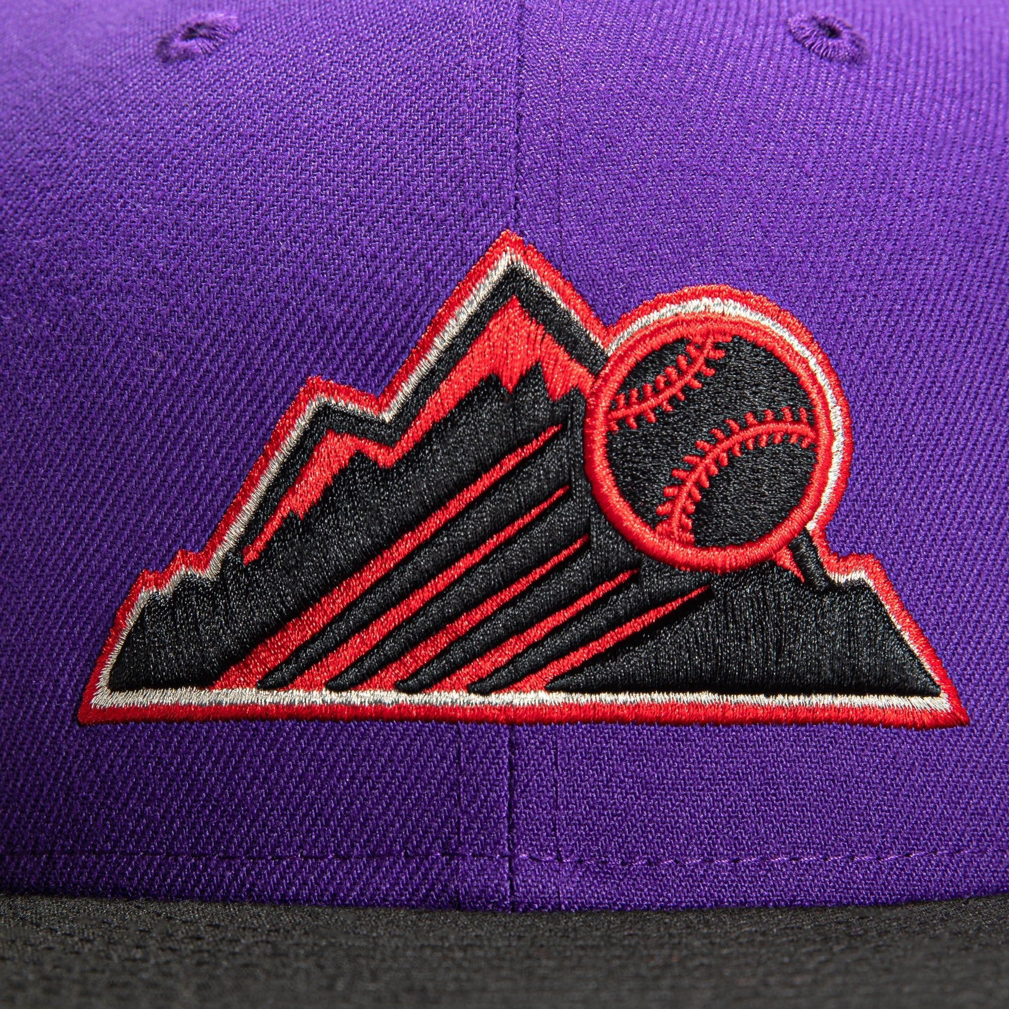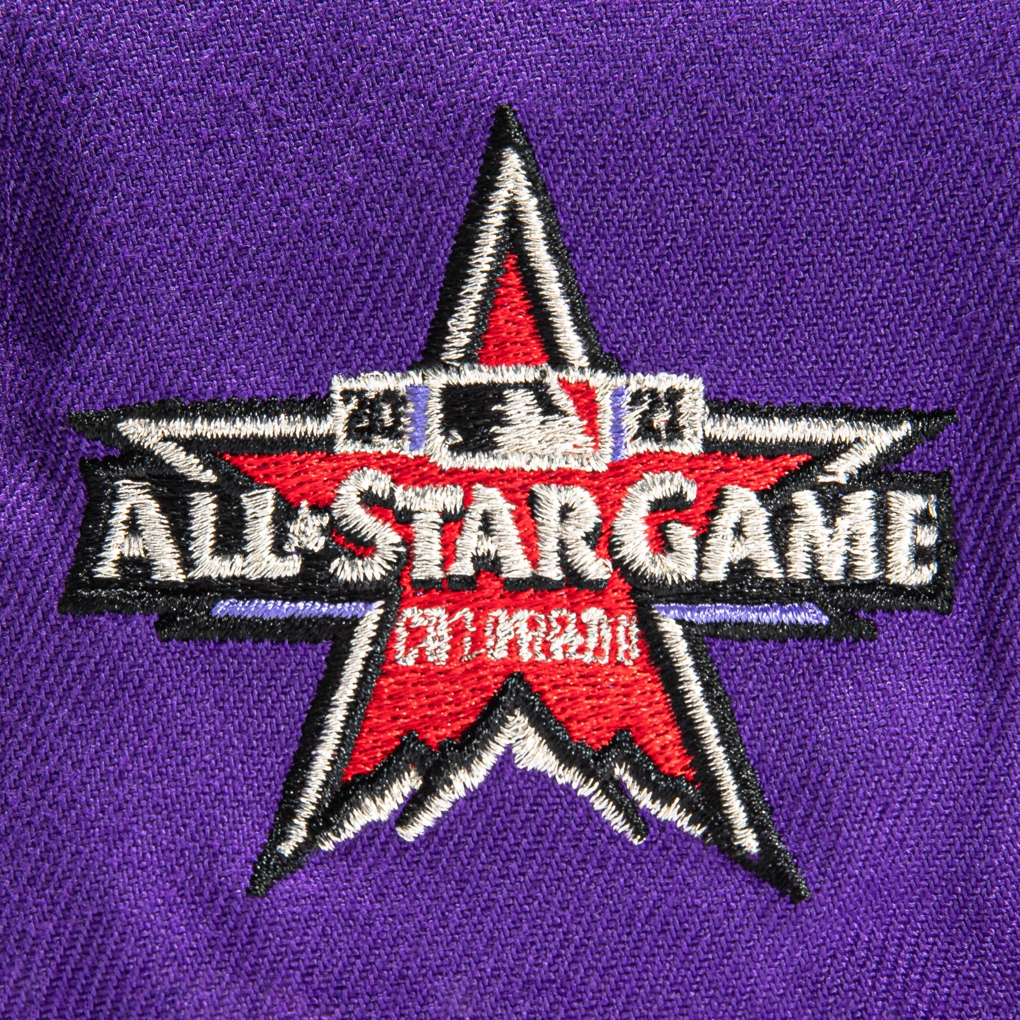 This New Era T-Dot Colorado Rockies 2021 All-Star Game 59FIFTY Fitted Hat is a Hat Club exclusive. It features a purple six panel structured high crown and embroidered eyelets with a black fabric squatchee button. The fitted cap has a black flat bill with a red undervisor. The front panel features the Colorado Rockies logo embroidery and a side patch embroidery on the right panel. The left panel of the fitted displays the New Era logo and the official MLB logo embroidery on the rear crown.