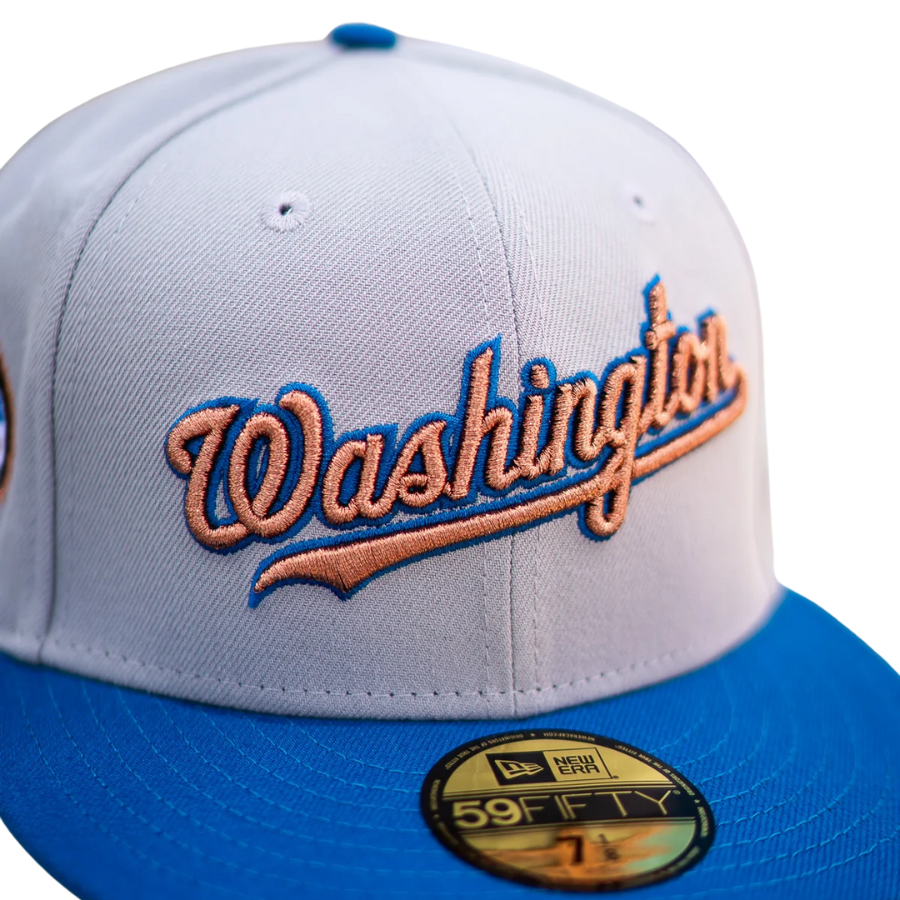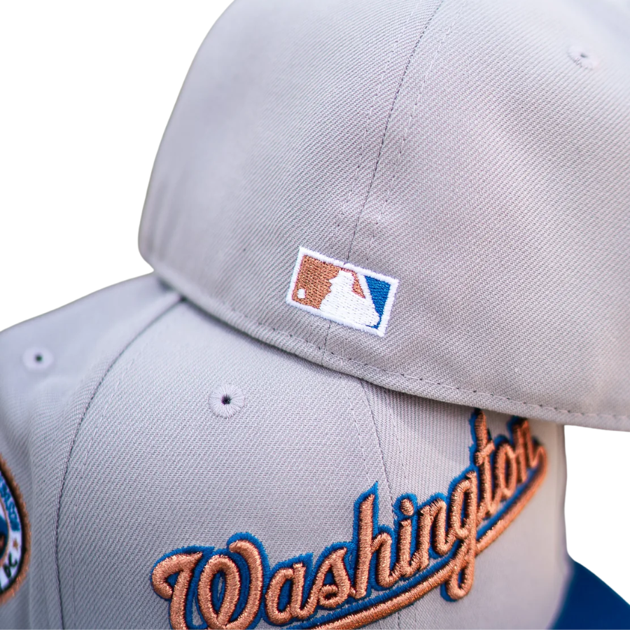 This New Era 59FIFTY Washington Nationals fitted hat was released by Sneaker Town. The fitted has a grey six panel structured high crown and embroidered eyelets with a true blue fabric squatchee button. The flat bill of the fitted is true blue with a grey undervisor. The front panel features a copper stitched Washington Nationals script logo embroidery with a 2008 Inaugural side patch on the right-wear side.