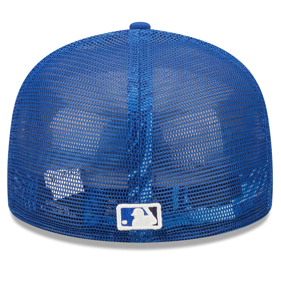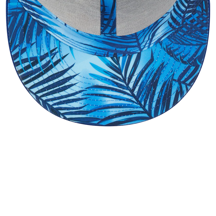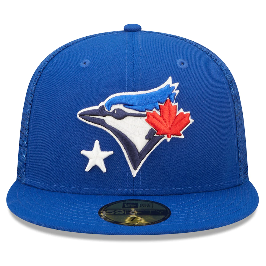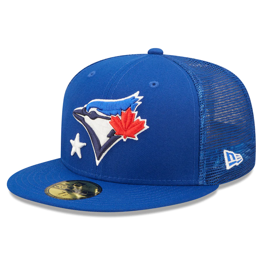 The Toronto Blue Jays 2022 All-Star Game Workout 59FIFTY Fitted Cap features an embroidered Blue Jays logo at the front panels with a 2022 All-Star Game patch at the right-wear side. Additional details include a matching MLB Batterman logo at the rear and a blue palm leaf undervisor.