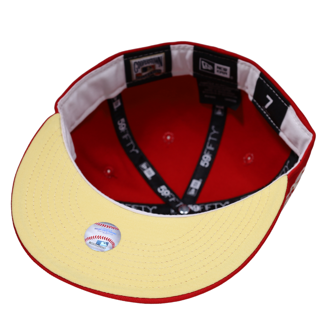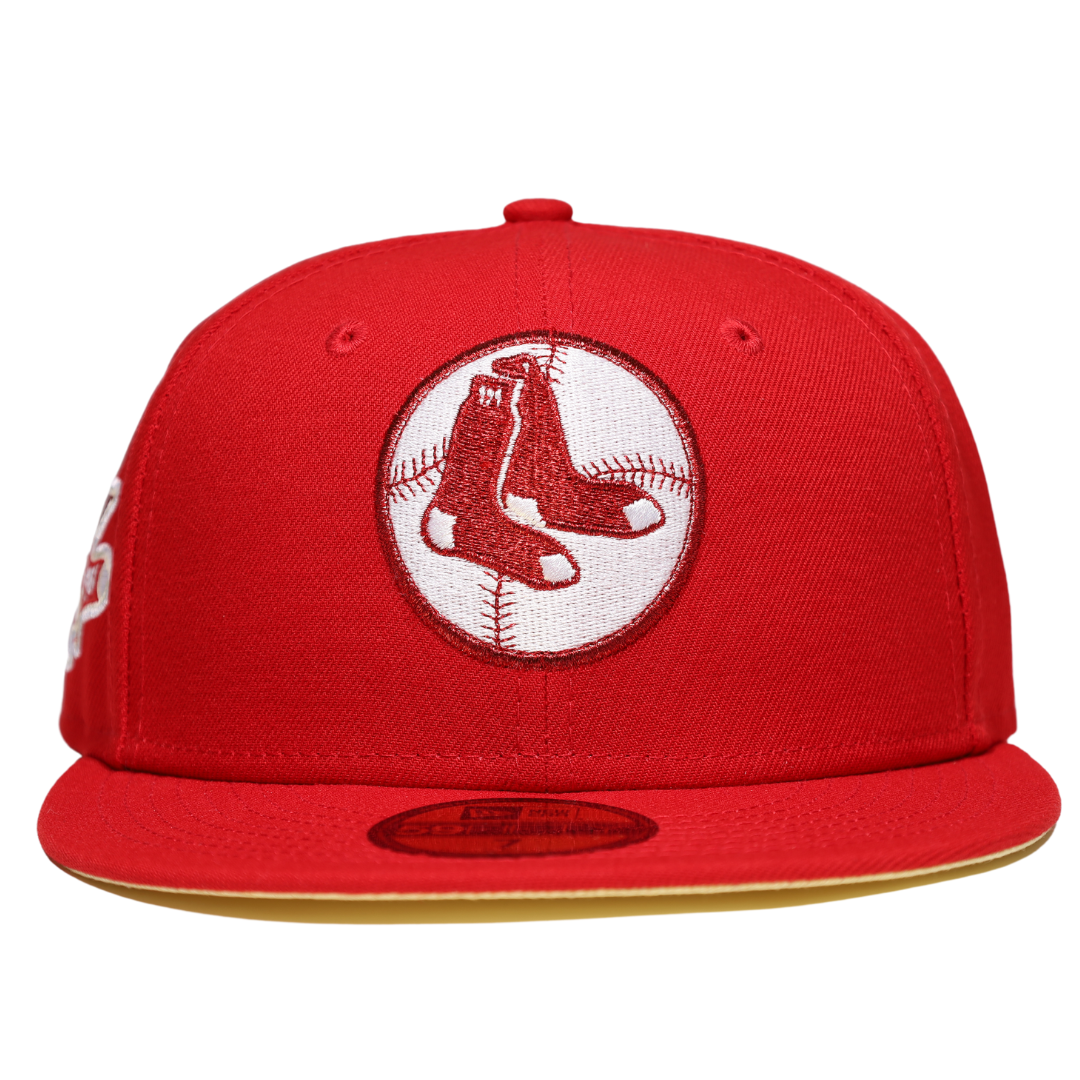 This New Era Boston Red Sox 1961 All-Star Game 59FIFTY Fitted Hat has a red six panel structured high crown, embroidered eyelets and fabric squatchee button. The fitted cap has a red flat bill with a white sweatband. The front panel features the Boston Red Sox logo embroidery and a soft yellow undervisor.