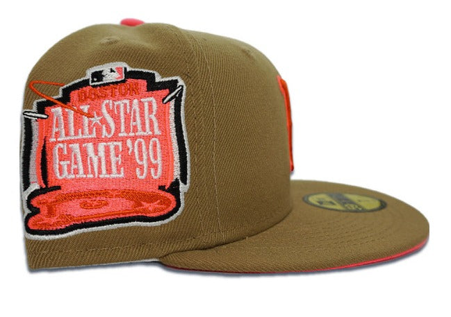 This New Era Boston Red Sox 'Coffee Pack' fitted hat has a tan six panel structured high crown and embroidered eyelets with a hot pink fabric squatchee button. The flat bill of the fitted is also tan with a hot pink undervisor and white sweatband. The front panel features the Boston Red Sox logo embroidered in orange and hot pink threads and the right panel features a 1999 All-Star Game side patch in the same colorway.