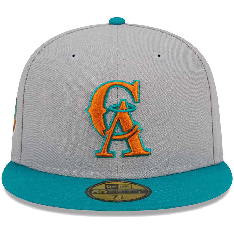 Take your headwear style to new heights effortlessly with this New Era California Angels Gray/Teal 59FIFTY fitted cap. Displaying your unwavering loyalty to the team is a piece of cake, thanks to the captivating embroidered California Angels graphics on the crown and a distinctive patch on the side.