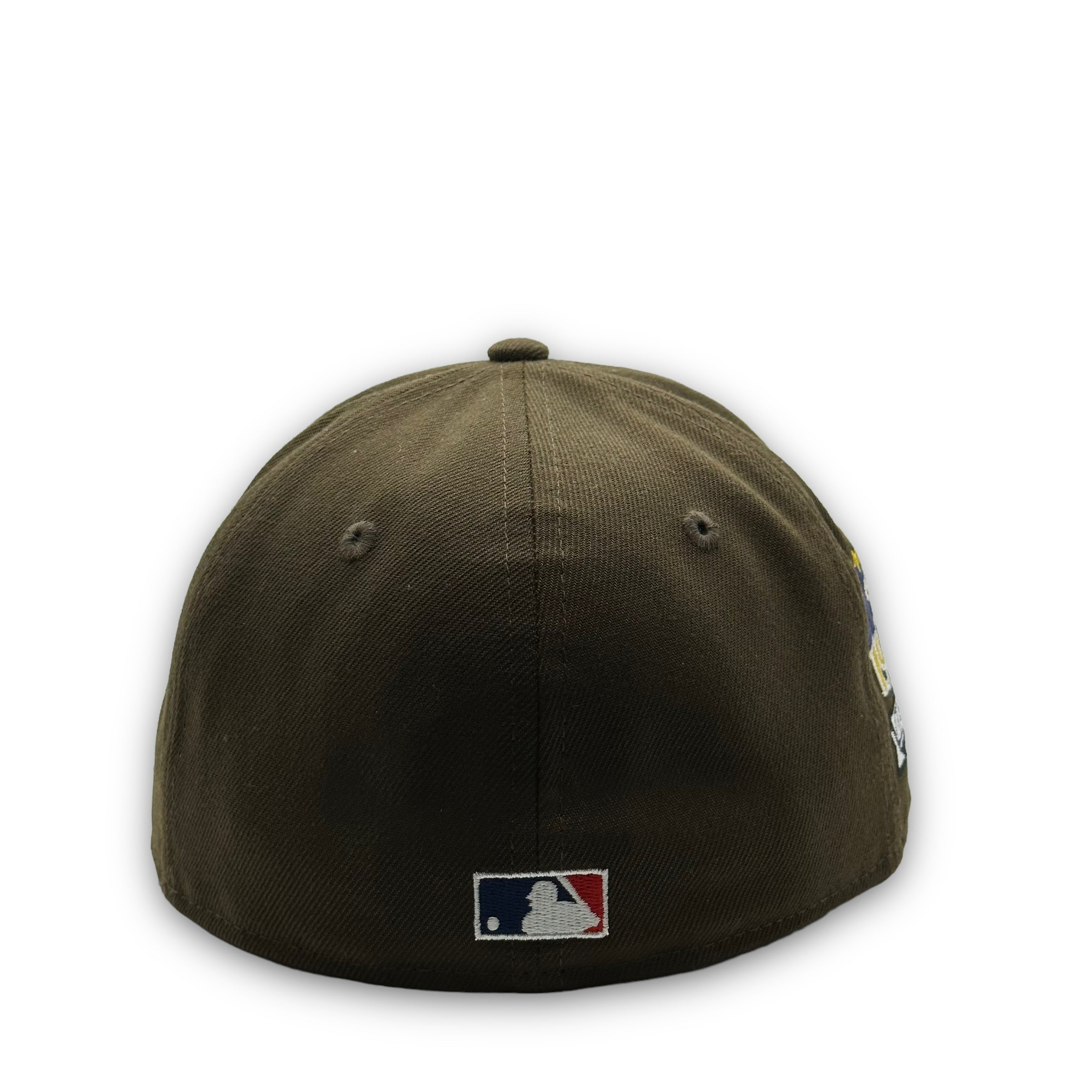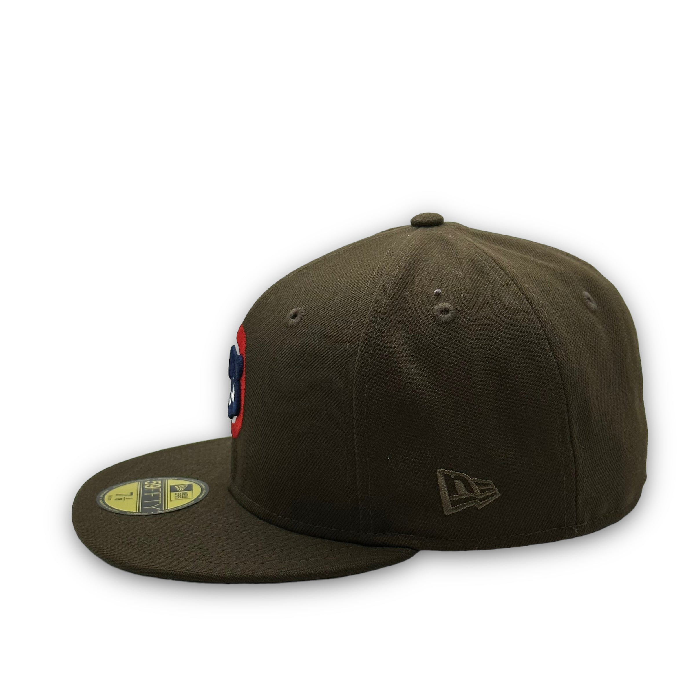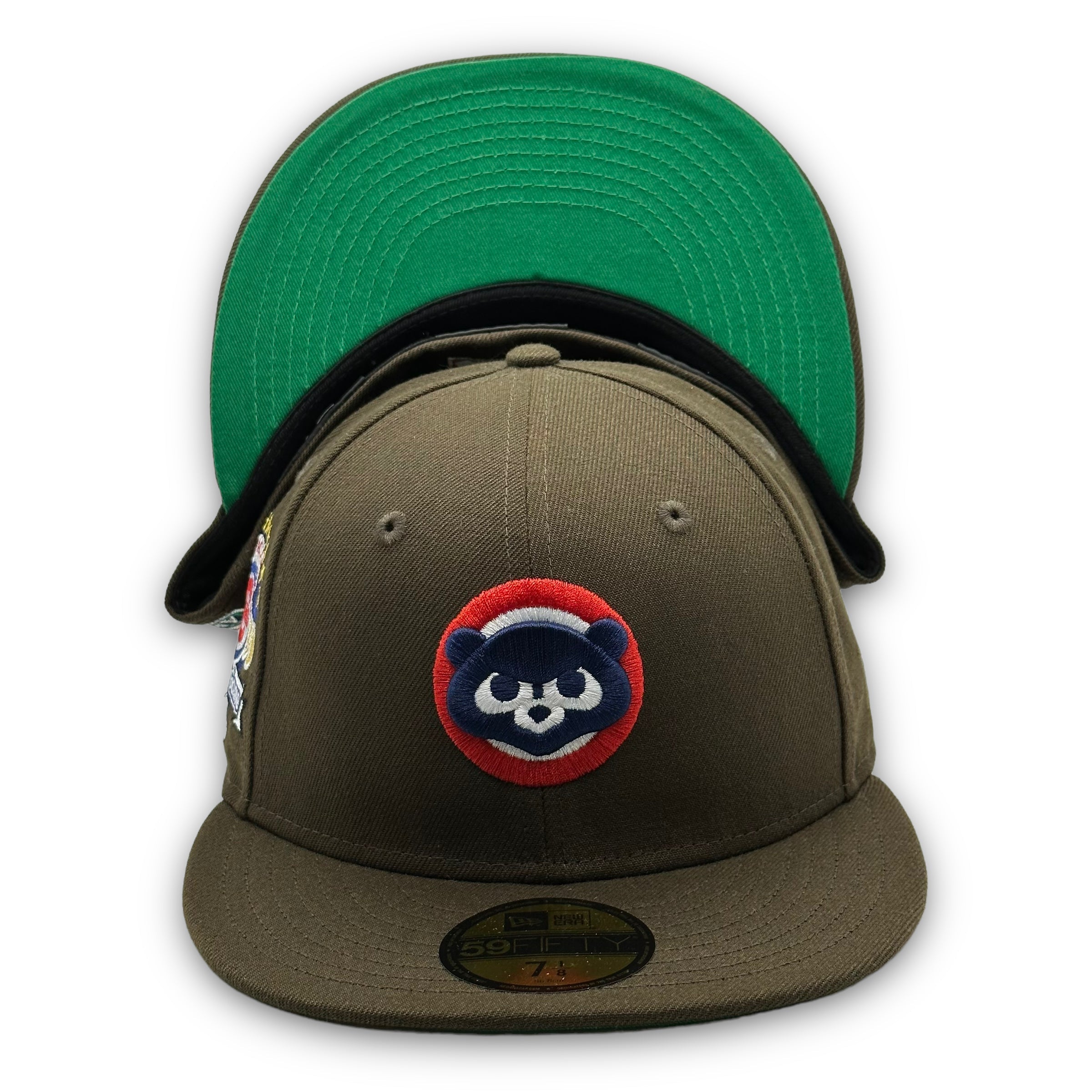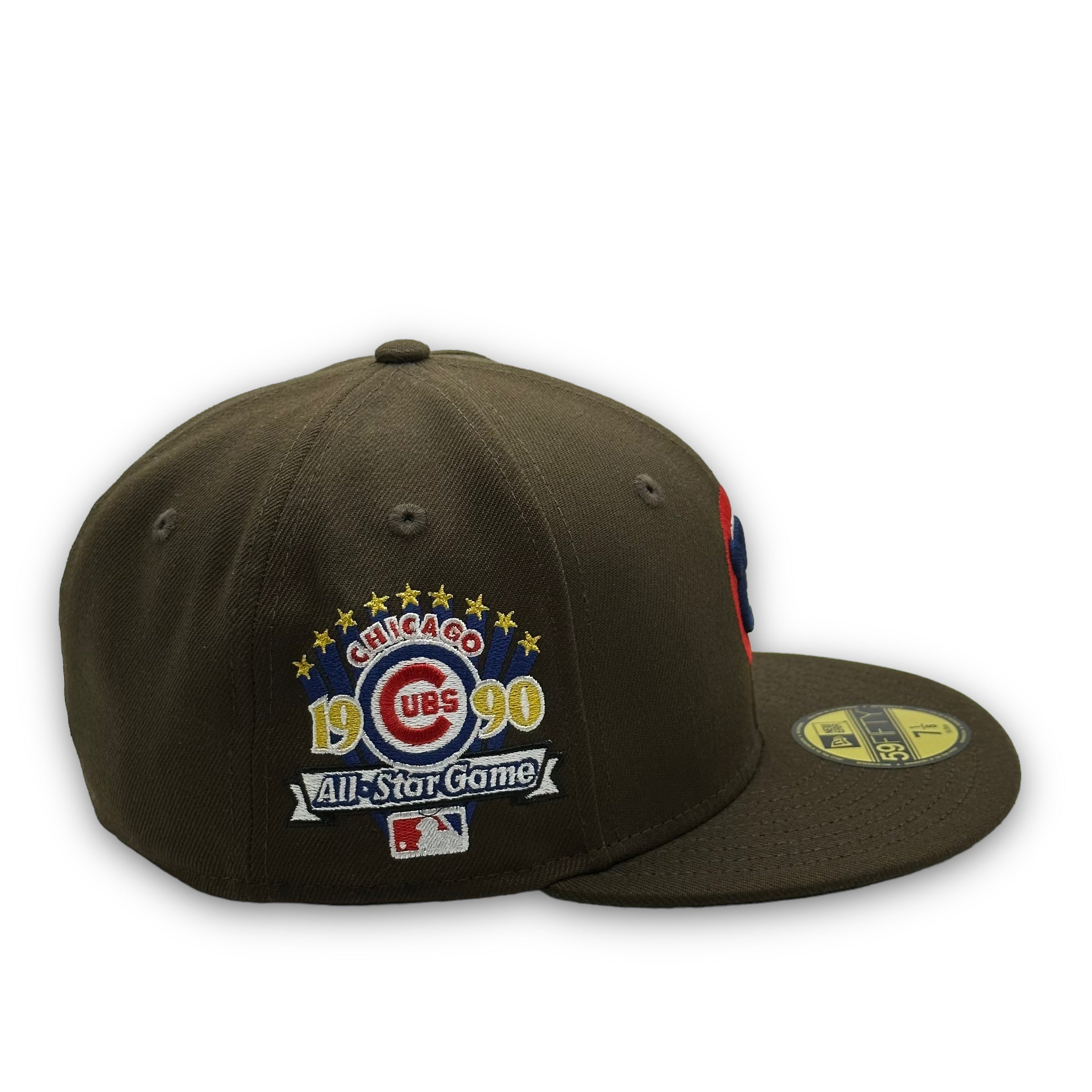 This New Era Chicago Cubs 1990 All-Star Game 'Kiwi Pack' 59FIFTY Fitted Hat was released by Burdeens Chicago. The fitted has a walnut brown six panel structured high crown, embroidered eyelets with and fabric squatchee button. The flat bill of the fitted cap is also walnut brown with a green bottom undervisor. The front panel features the Chicago Cubs logo embroidery and a side patch embroidered on the right panel. The left panel of the fitted displays the New Era logo and the official Chicago Cubs script embroidered on the rear crown.
