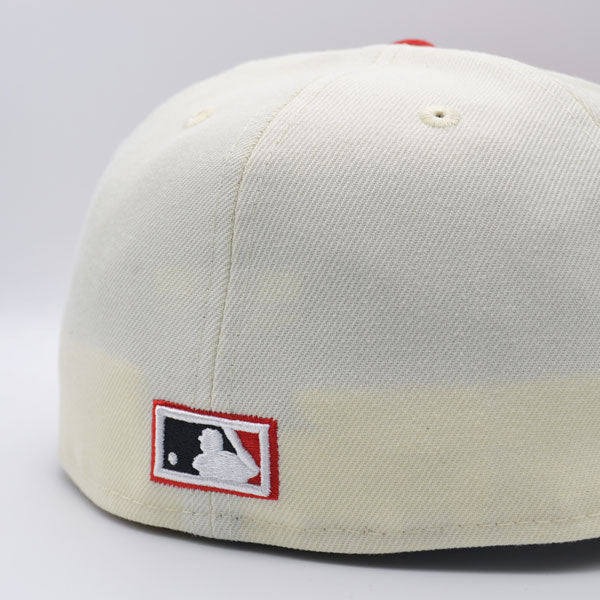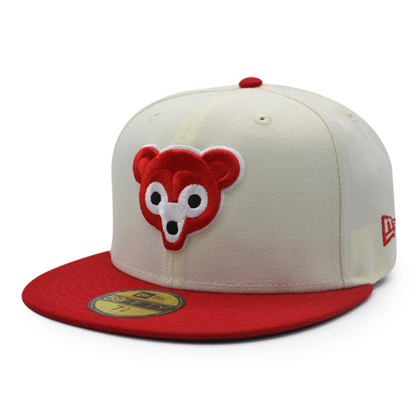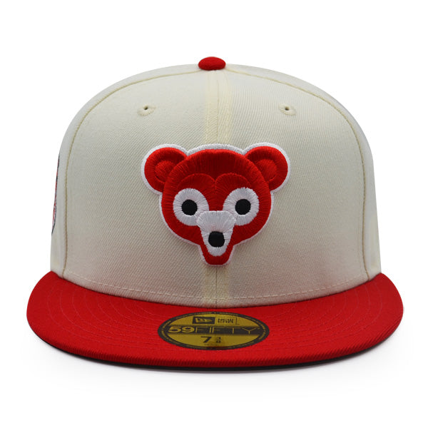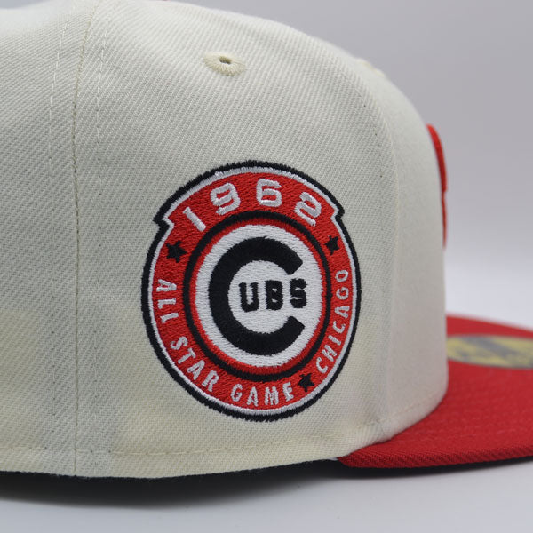 This New Era Chicago Cubs 59FIFTY fitted hat has a chrome six panel structured high crown, chrome embroidered eyelets and a red fabric squatchee button. The fitted cap also has a red flat bill with a black undervisor and white sweatband. The front panel features the Chicago Cubs logo embroidery and a 1962 All-Star Game side patch embroidery on the right panel. The left panel of the fitted displays the New Era logo and the official MLB logo embroidery on the rear crown.