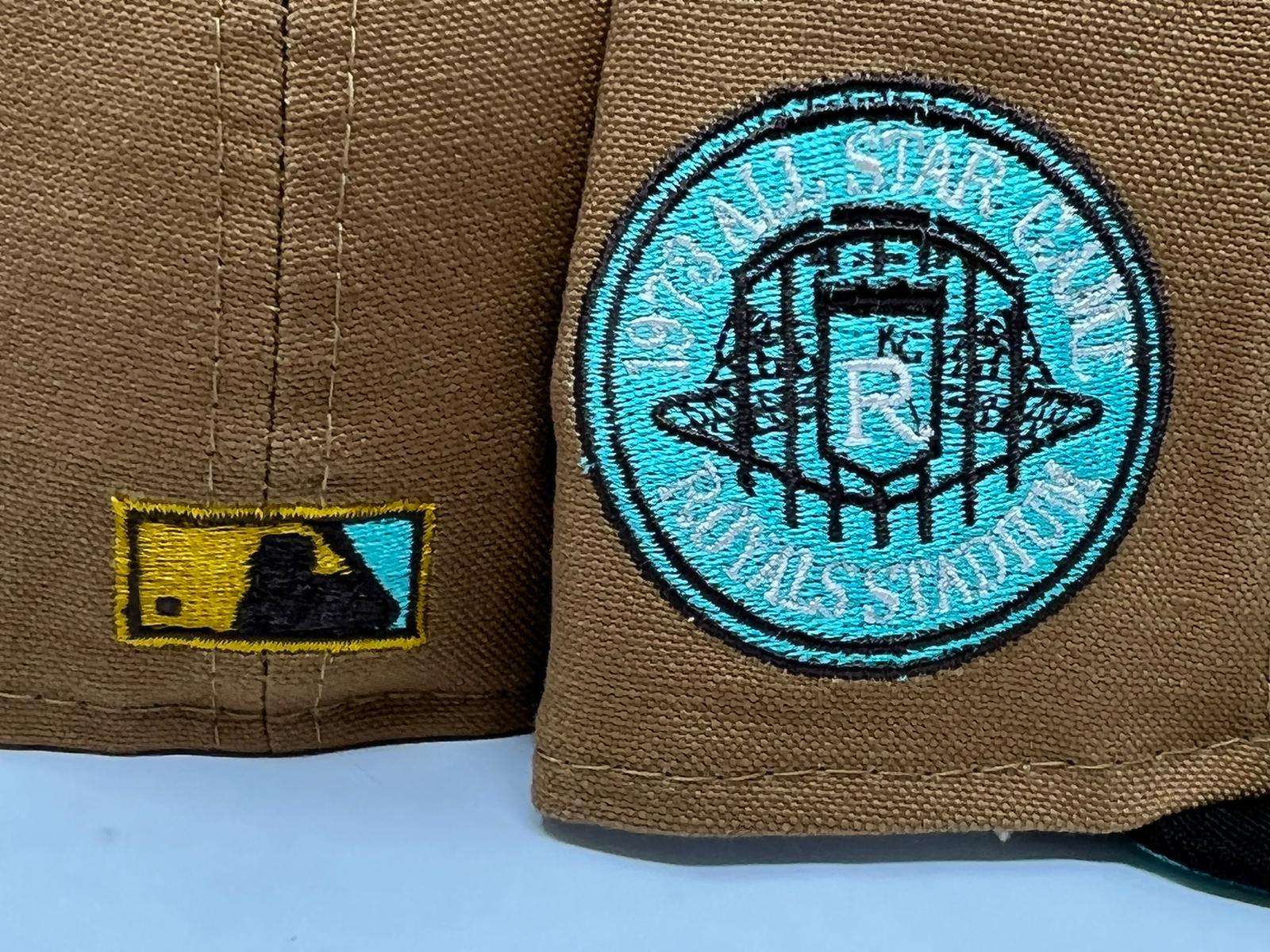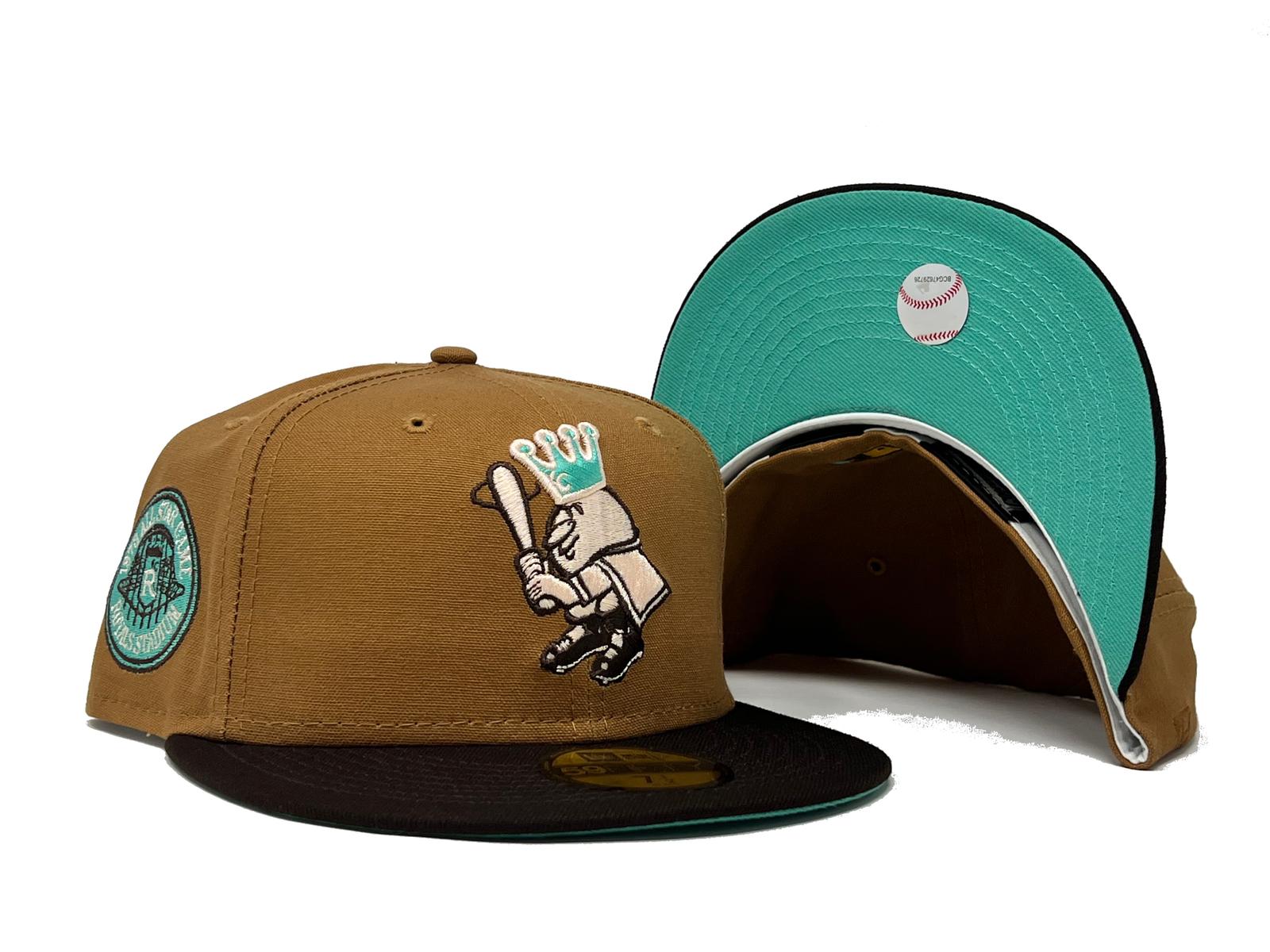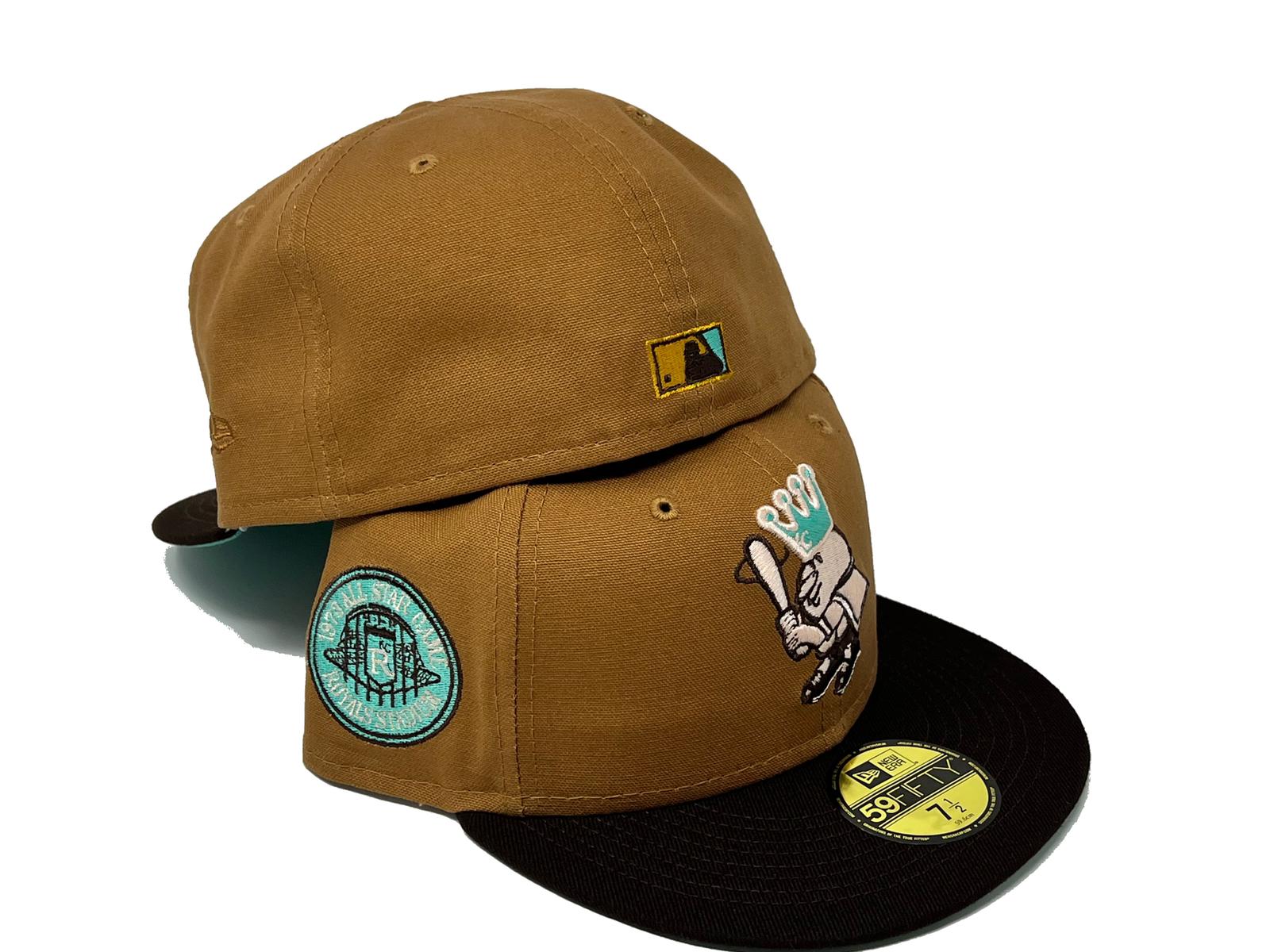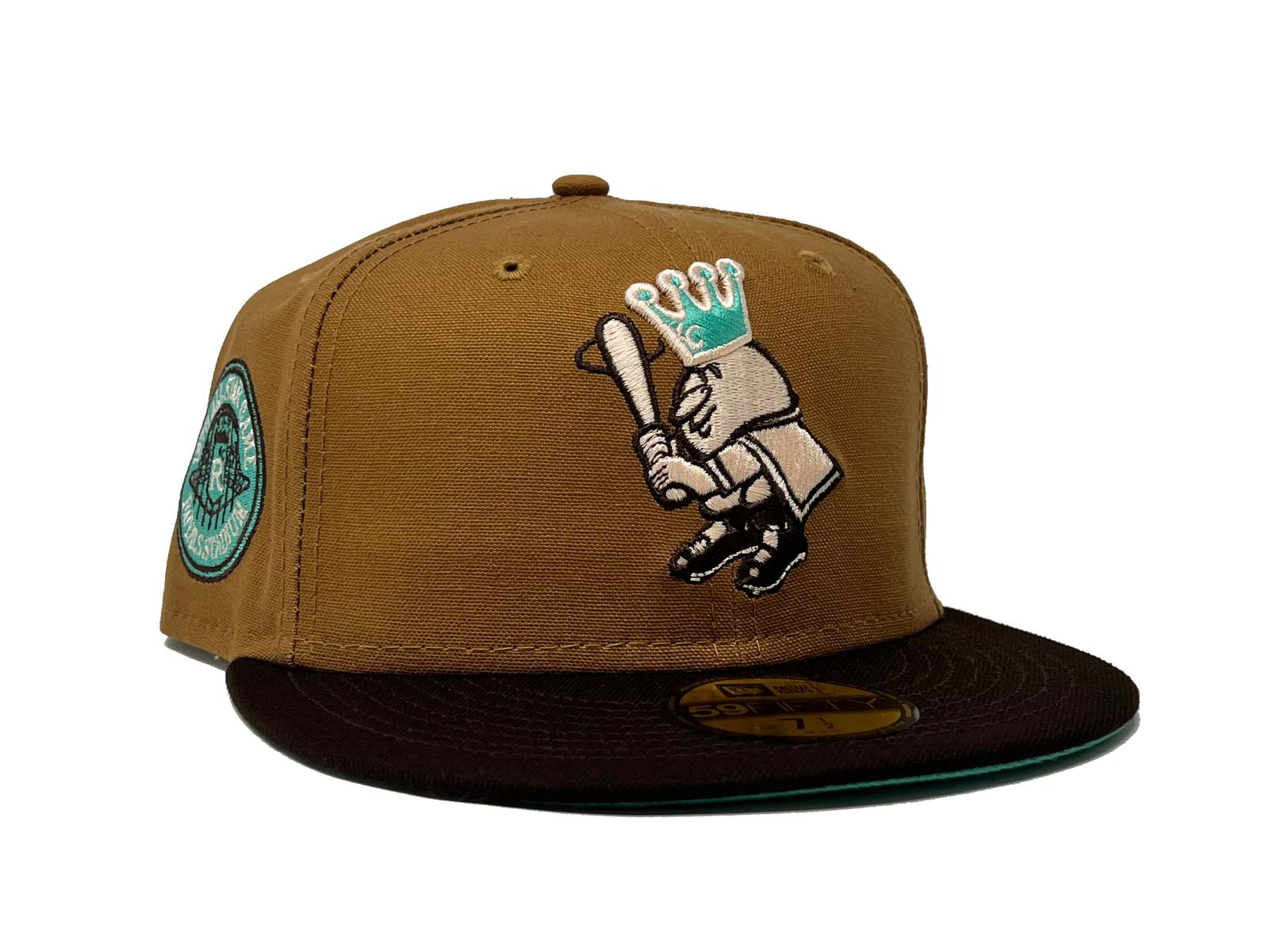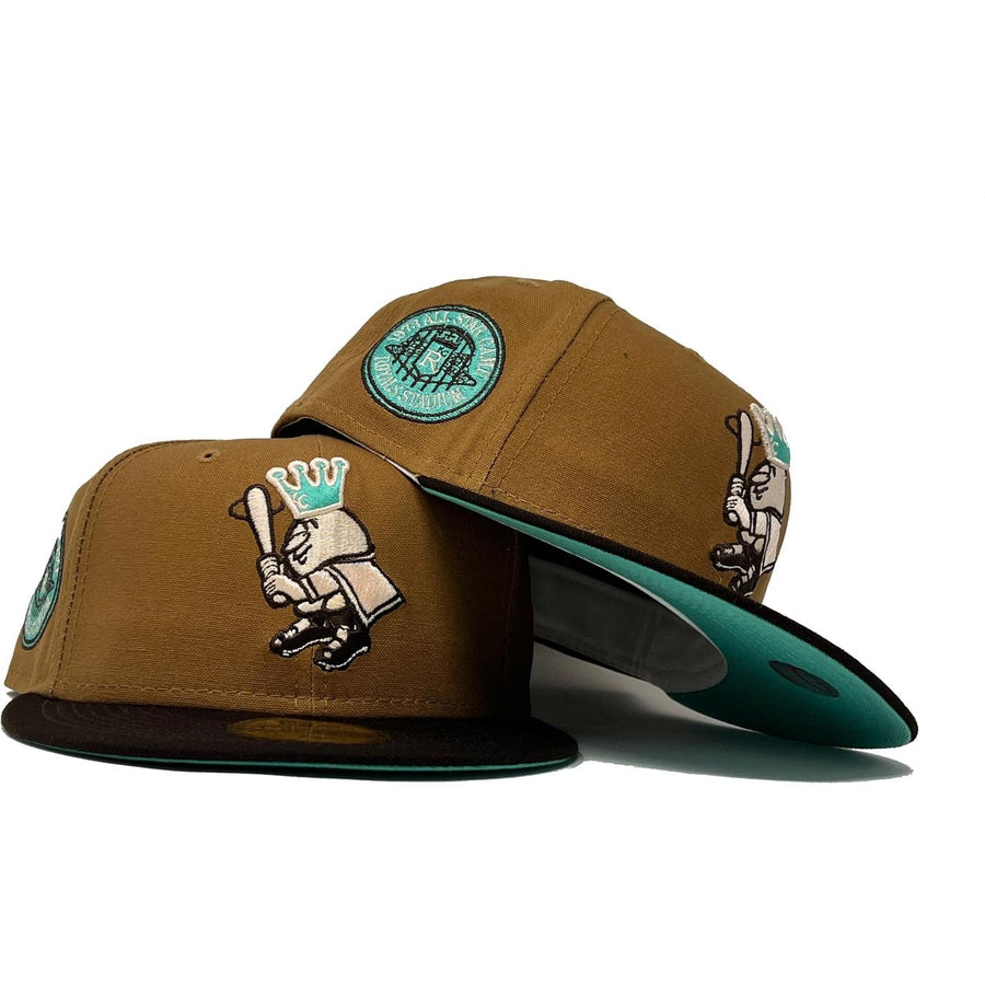 The New Era Kansas City Royals 59FIFTY fitted hat has a brown six panel structured high crown, embroidered eyelets and fabric squatchee button. The flat bill of the fitted cap features a dark walnut brown with a mint green undervisor and white sweatband. The front panel features the Kansas City Royals teams logo embroidery with a side patch embroidery on the right panel in the same colorway.