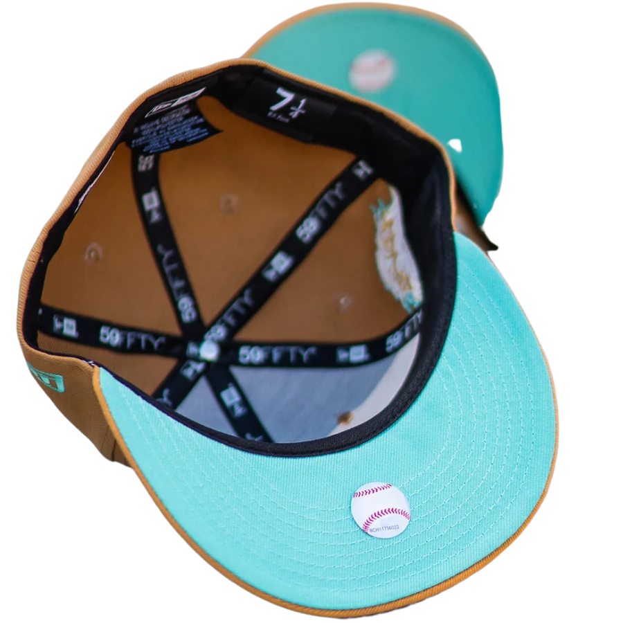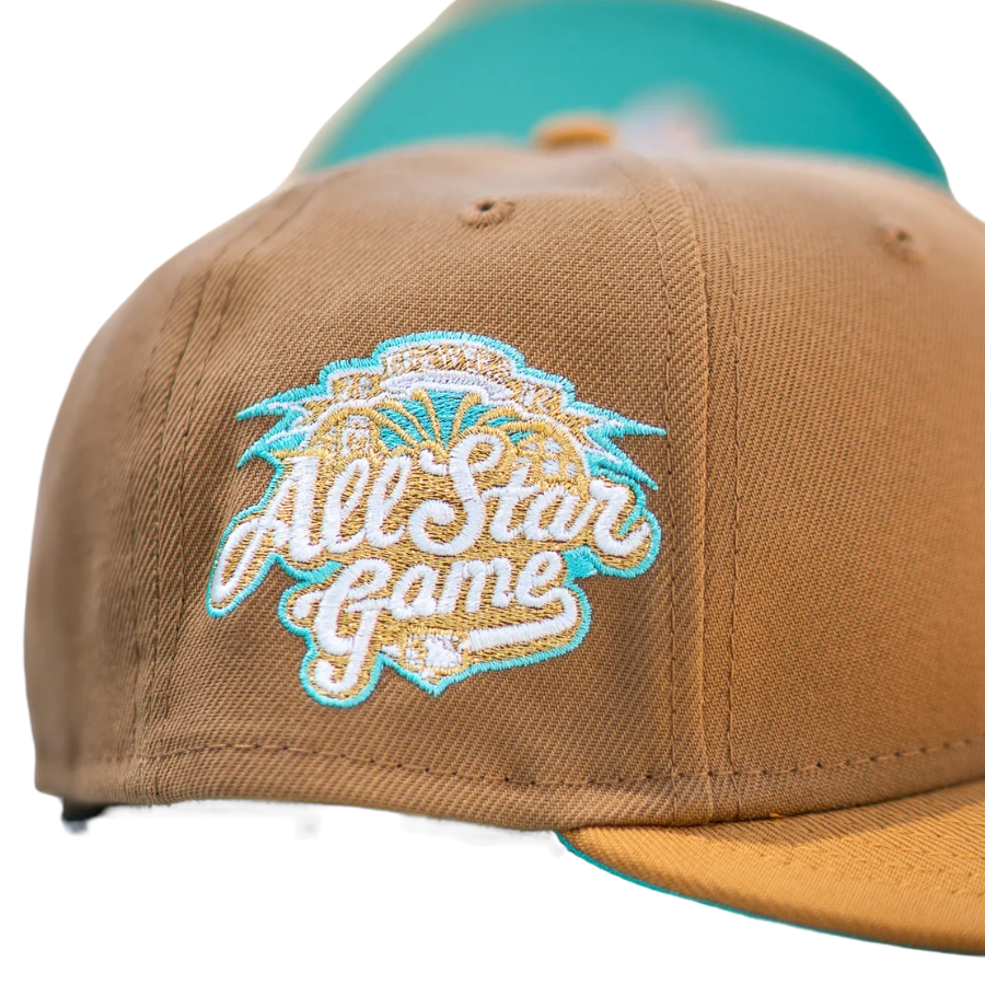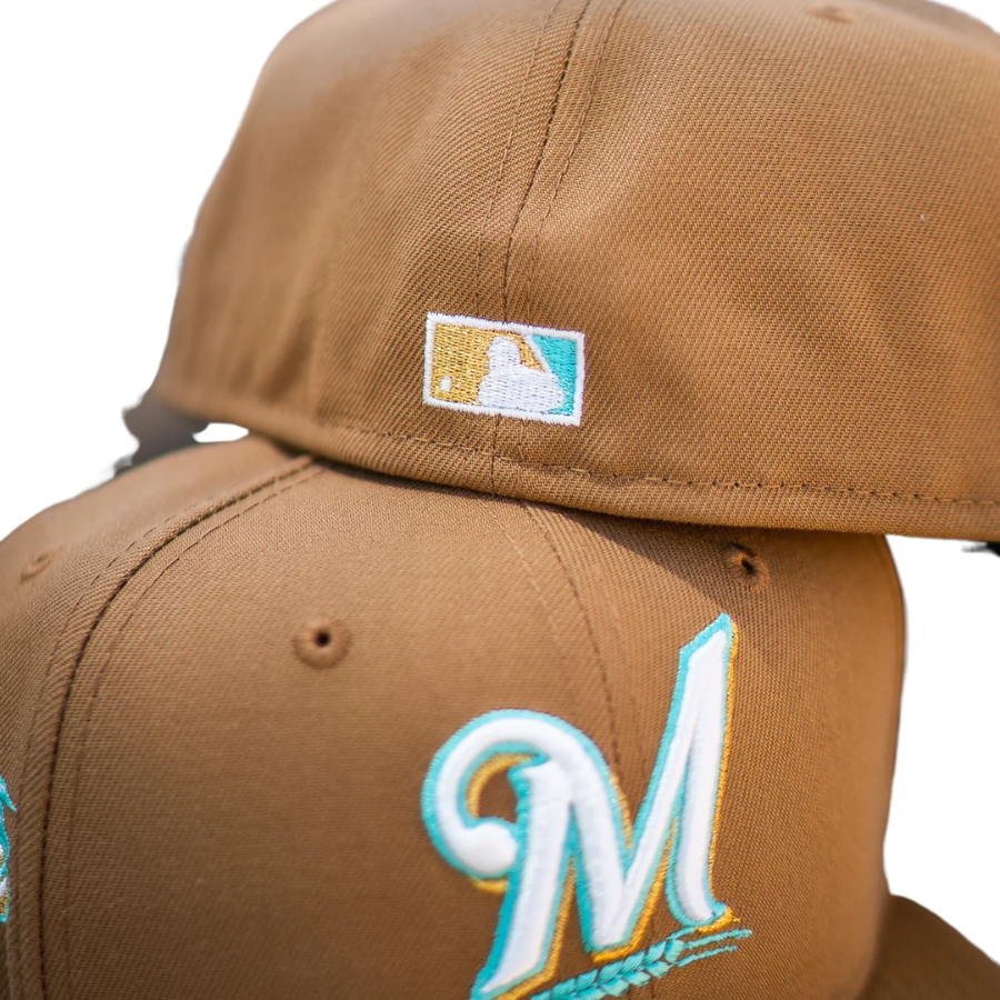 This New Era 59FIFTY Milwaukee Brewers fitted hat was released by Sneaker Town. The fitted has a khaki six panel structured high crown and embroidered eyelets with a khaki fabric squatchee button. The flat bill of the fitted is khaki with a teal undervisor. The front panel features a white and teal stitched Milwaukee Brewers logo embroidery with a 2002 All-Star Game side patch on the right-wear side.