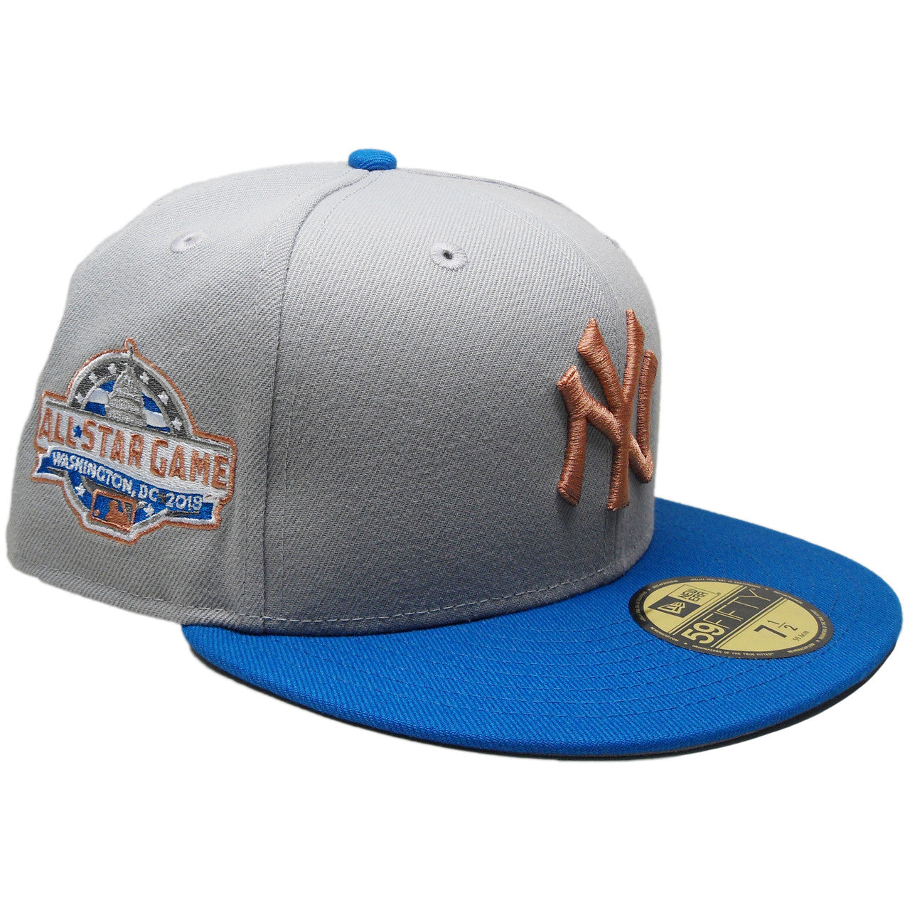 This New Era New York Yankees 59FIFTY fitted hat was released by Ecapsunlimited. The fitted has a gray six panel structured high crown and embroidered eyelets with a blue fabric squatchee button and flat bill. The fitted has a gray bottom undervsior with a white sweatband. The front panel includes the New York Yankees logo embroidered in copper stitching with a 2019 All-Star Game side patch on the right panel.