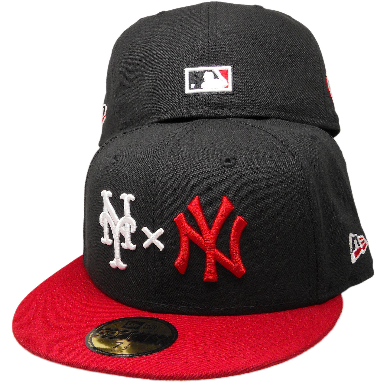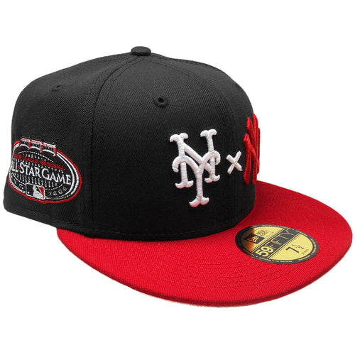 This New Era New York Mets x New York Yankees dual 59FIFTY fitted hat has a black six panel structured high crown, embroidered eyelets and fabric squatchee button. The flat bill of the fitted is red with a pink undervisor. The front panel features the NY Metss logo embroidered in white thread and New York Yankees logo embroidered in red thread. The right panel features a 2008 All-Star Game side patch on the right panel.