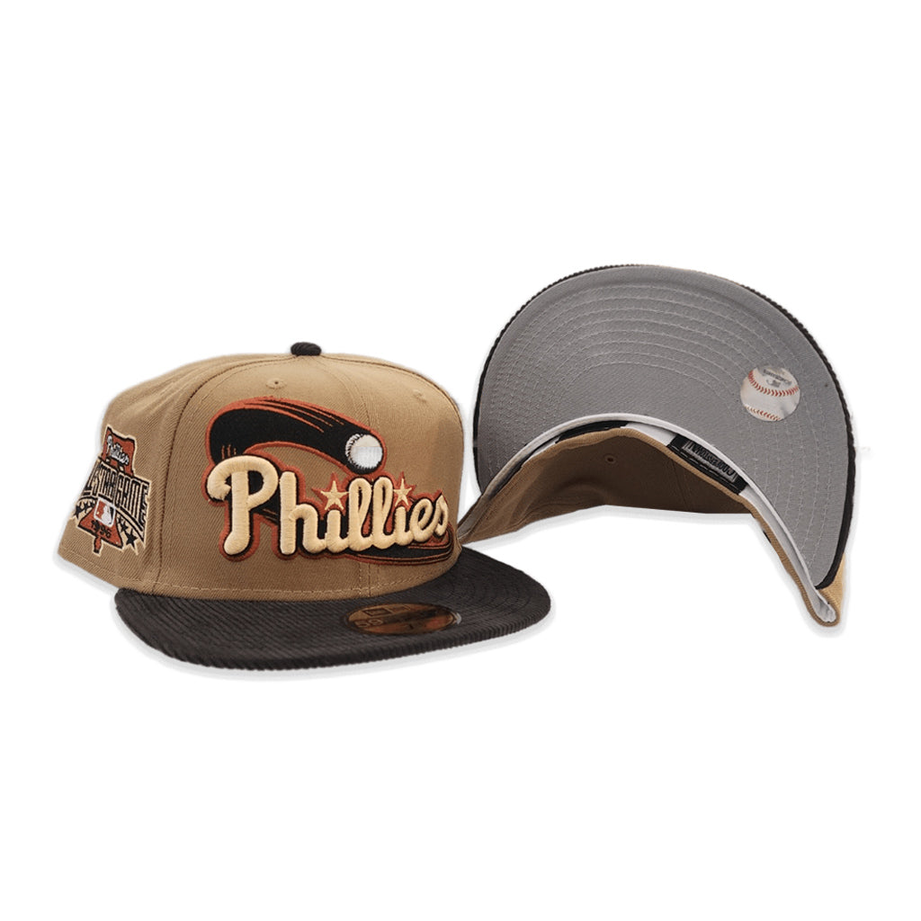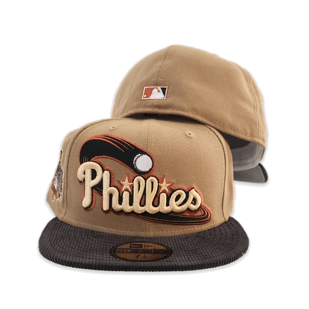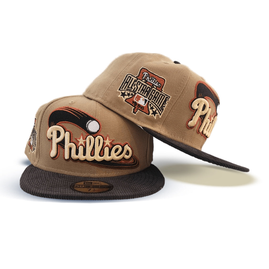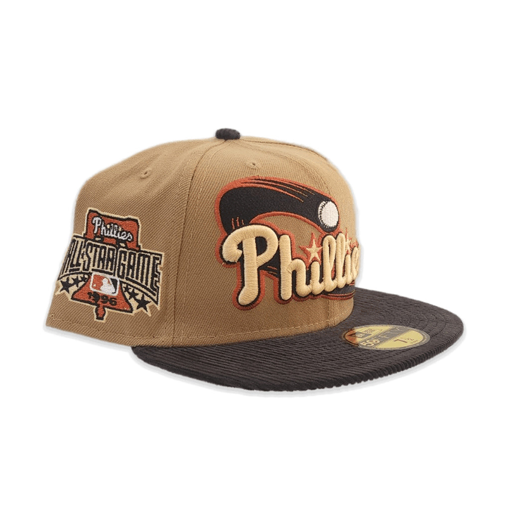 This New Era Philadelphia Phillies 1996 All-Star Game Khaki/Black Corduroy 59FIFTY Fitted Hat has a khaki six panel structured high crown and embroidered eyelets with a black fabric squatchee button. The fitted cap also has a black corduroy flat bill with a grey undervisor and white sweatband. The front panel features the Phillies logo embroidery and a 1996 ASG side patch embroidery on the right panel. The left panel of the fitted displays the New Era logo and the official MLB Batterman embroidery on the rear crown.