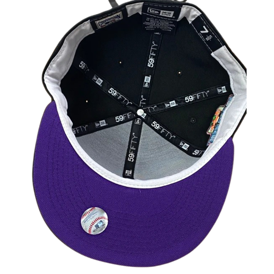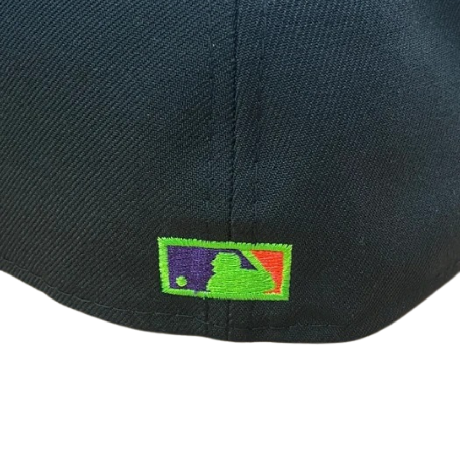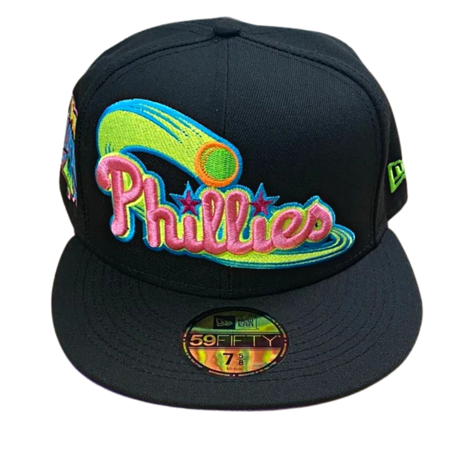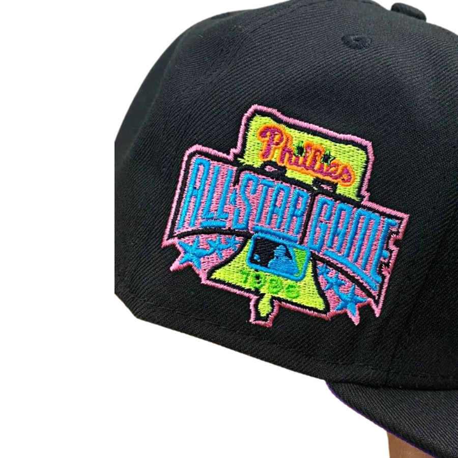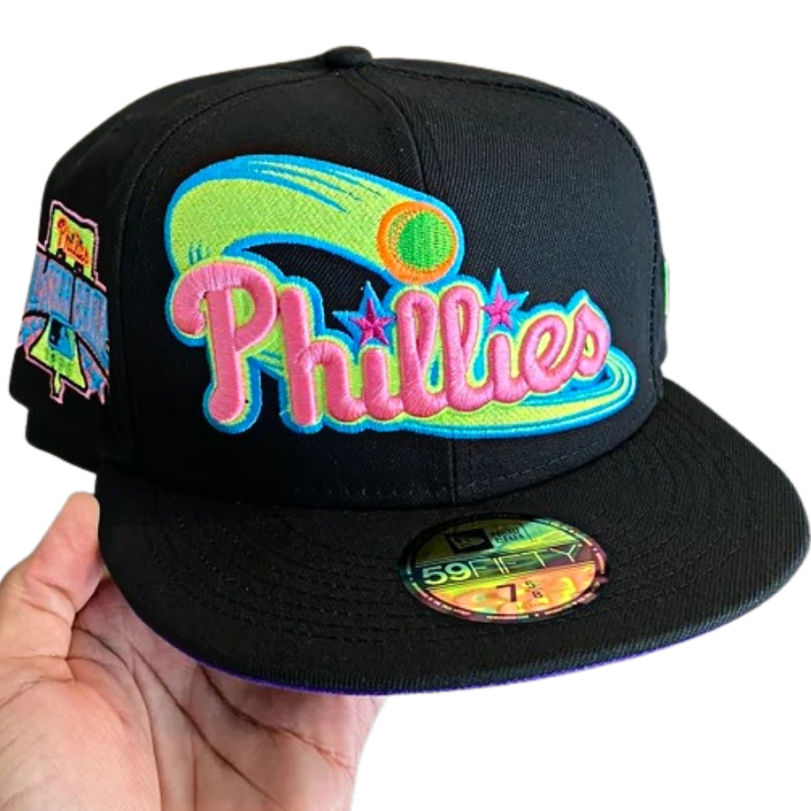 This New Era Philadelphia Phillies "Laser Survival" inspired fitted hat is a My Fitteds exclusive release. The 59FIFTY fitted has a black six panel structured high crown, embroidered eyelets and fabric squatchee button. The flat bill of the fitted cap is also black with a purple undervisor and white sweatband. The front panel features the Philadelphia Phillies logo embroidered in neon green, fluorescent pink, orange and teal threads. The right panel features a 1996 All-Star Game side patch embroidered in the same colorway as the primary logo.
