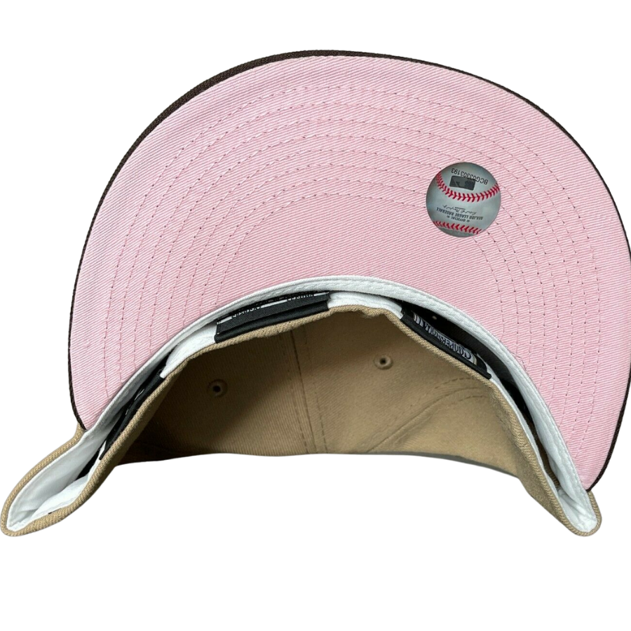 This New Era Pittsburgh Pirates Cappuccino fitted hat has a tan six panel structured high crown, embroidered eyelets and fabric squatchee button. The flat bill of the fitted is dark brown with a soft pink undervisor and white sweatband. The front panel features the Pittsburgh Pirates logo embroidery with a 1994 All-Star Game side patch on the right panel.