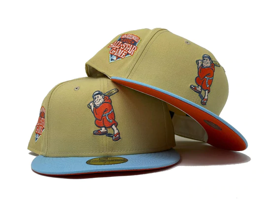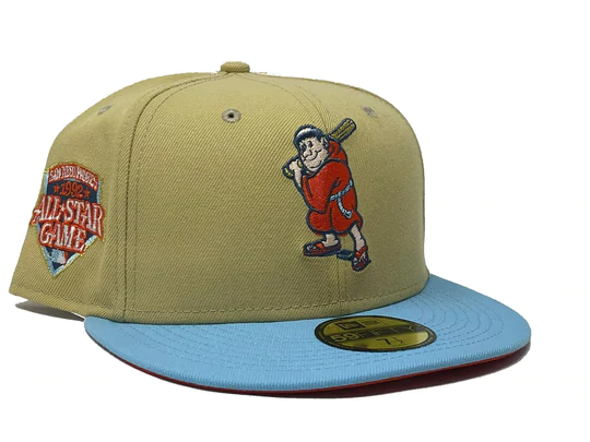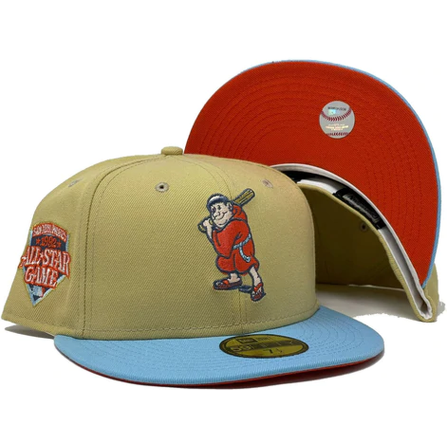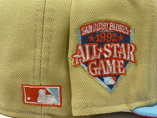 This New Era San Diego Padres 59FIFTY fitted hat has a vegas gold six panel structured high crown, vegas gold embroidered eyelets and a vegas gold fabric squatchee button. The fitted cap also has a sky blue flat bill with a orange undervisor and white sweatband. The front panel features the San Diego Padres logo embroidery and a side patch embroidery on the right panel. The left panel of the fitted displays the New Era logo and the rear crown features the official MLB logo embroidery.