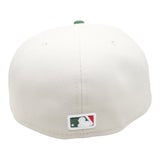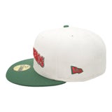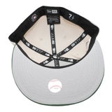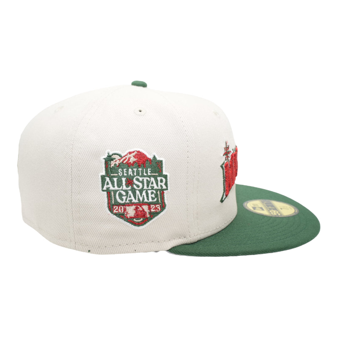 This New Era Seattle Mariners 'Marineros' fitted hat released by Hat Stop has a stone six panel structured high crown and embroidered eyelets with a cilantro fabric squatchee button. The fitted cap also has a cilantro flat bill with a grey undervisor and black sweatband. The front panel features the Seattle Mariners logo embroidery and a 2023 All-Star Game side patch embroidered on the right panel. The left panel of the fitted displays the New Era logo and the official MLB Batterman logo embroidery on the rear crown.