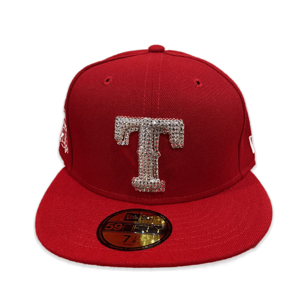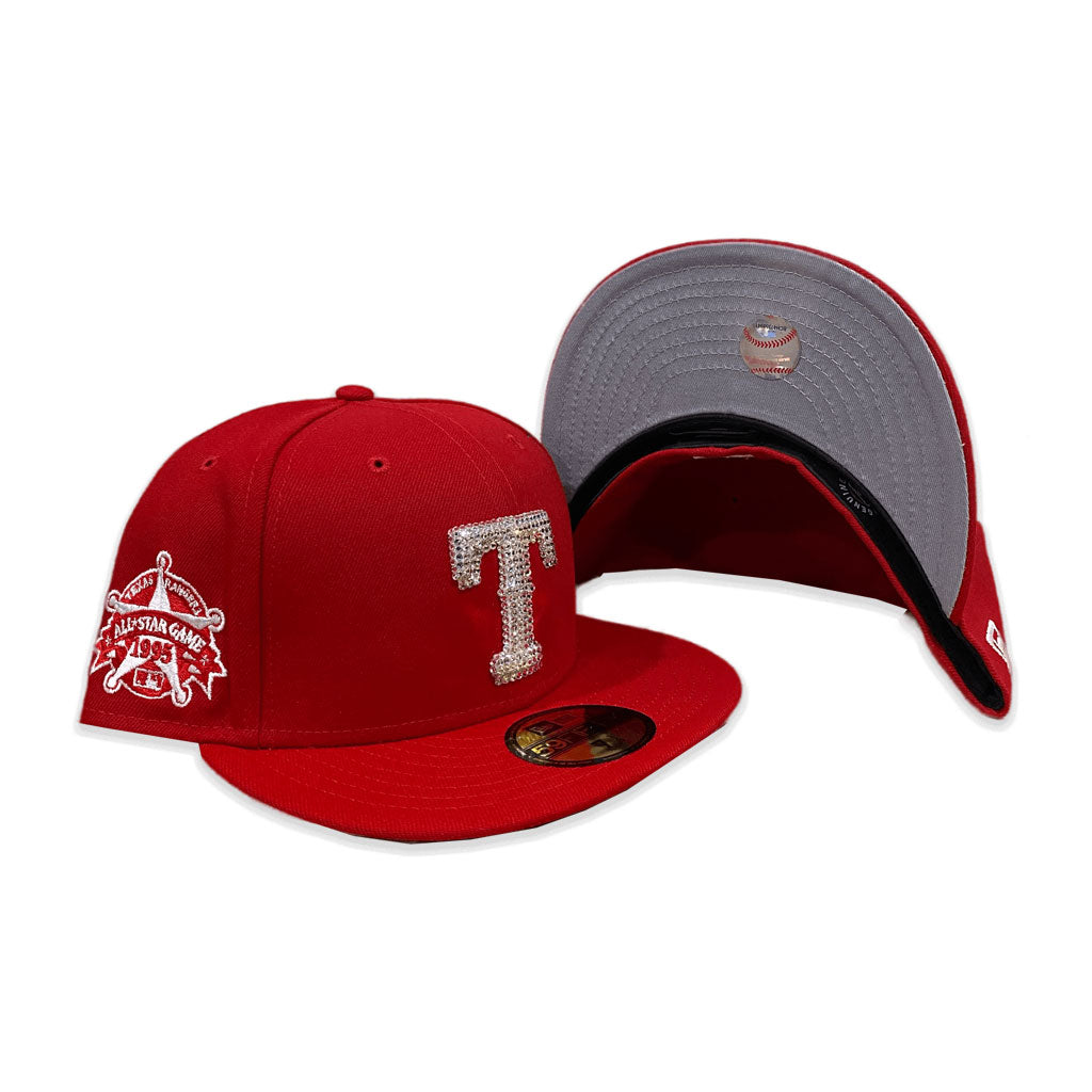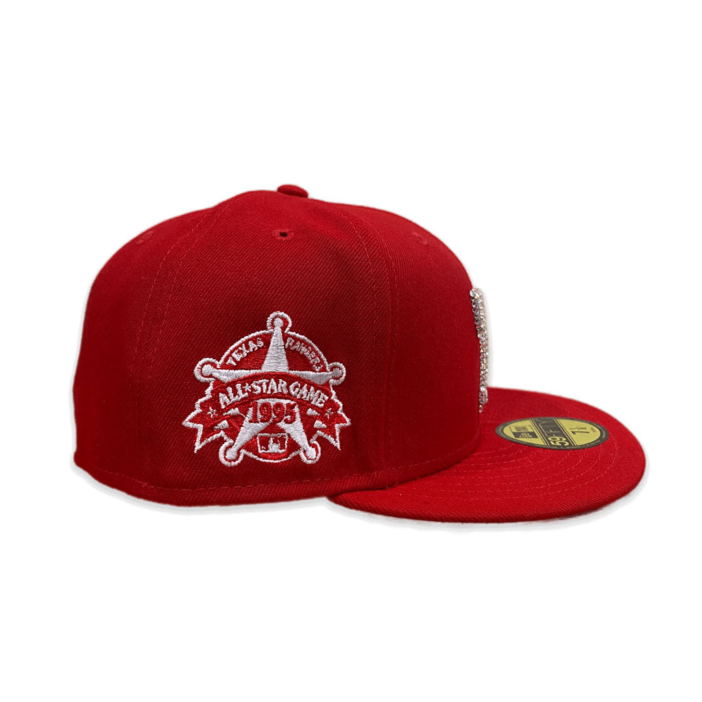 This New Era Texas Rangers 1995 All-Star Game Red Swarovski 59FIFTY Fitted Hat was released by Exclusive Fitted. The fitted has a red six panel structured high crown, embroidered eyelets and fabric squatchee button. The flat bill of the fitted cap is also red with a grey undervisor and black sweatband. The front panel features the Texas Rangers logo embroidered in white stitching with swarovski crystals all over. The left panel of the fitted displays the New Era logo and celebratory side patch on the right panel. The official MLB Batterman logo is embroidered on the rear crown.