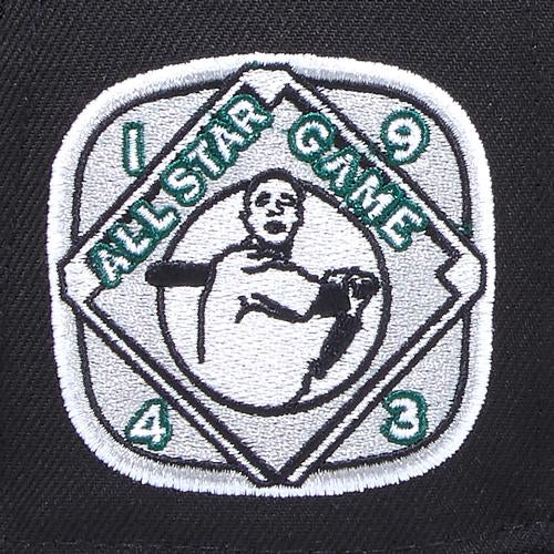 This New Era Boston Red Sox 59FIFTY fitted hat was released by Eblens. The fitted has a black six panel structured high crown and embroidered eyelets with a dark green fabric squatchee button and flat bill. The front panel features the Boston Red Sox logo embroidered in dark green and white stitching with a 1943 All-Star Game side patch on the right panel.