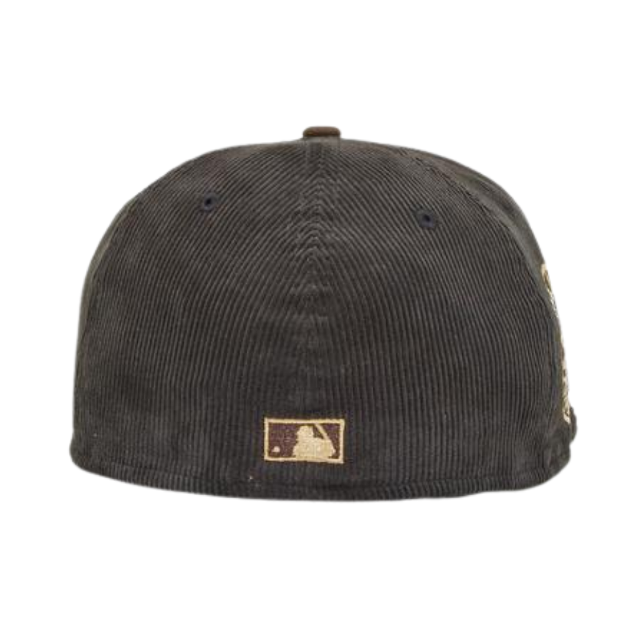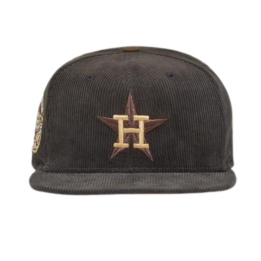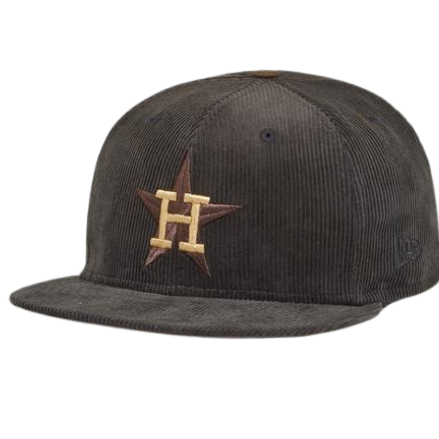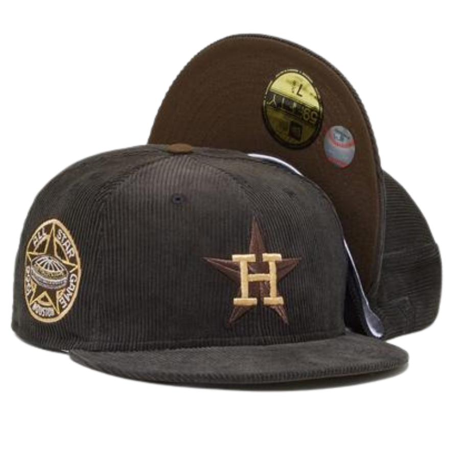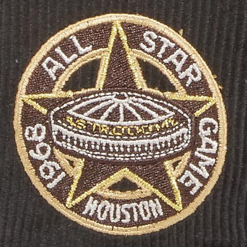 This New Era Houston Astros 59FIFTY fitted hat is an exclusive release by Eblens. The fitted has a walnut brown corduroy six panel structured high crown, embroidered eyelets and squatchee button. The fitted cap also has a walnut brown corduroy flat bill with a dark brown undervisor and white sweatband. The front panel features the Houston Astros logo embroidery and a 1968 All-Star Game side patch embroidery on the right panel. The left panel of the fitted displays the New Era logo and the official MLB Batterman logo embroidery on the rear crown.