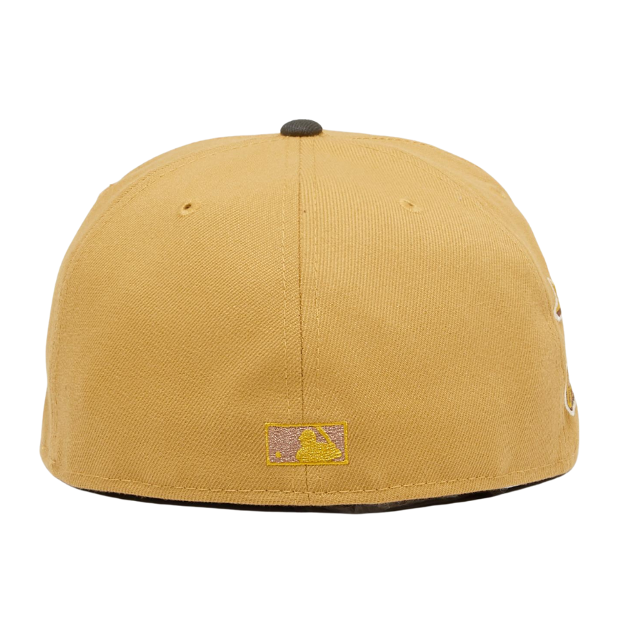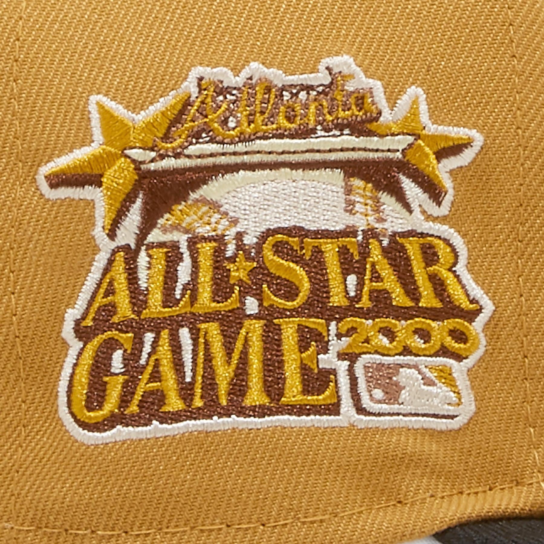 This Montreal Expos fitted hat is an exclusive release from Eblens. The fitted has a panama tan six panel structured high crown and embroidered eyelets with a black fabric squatchee button. The fitted cap also has a black flat bill with a grey undervisor and white sweatband. The front panel features the Montreal Expos logo embroidery and an All-Star Game side patch embroidery on the right panel. The left panel of the fitted displays the New Era logo and the official MLB Batterman logo embroidery on the rear crown.