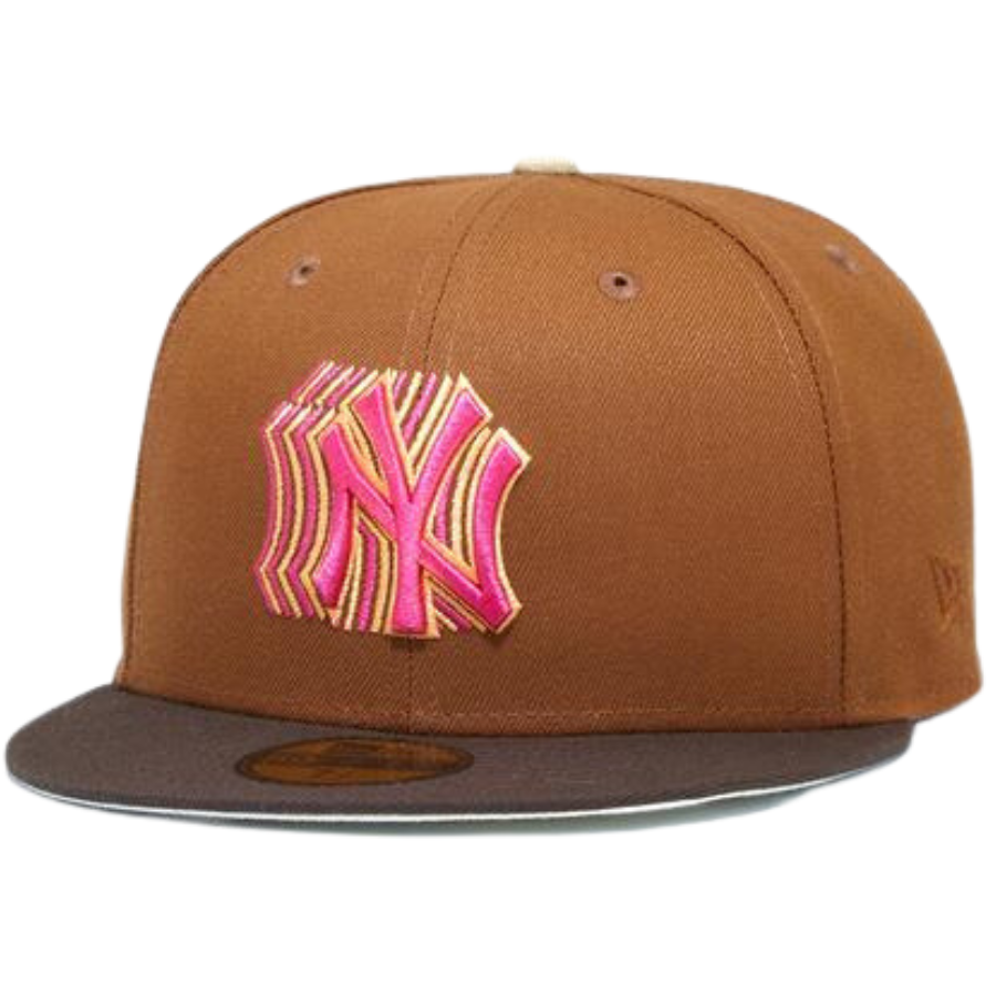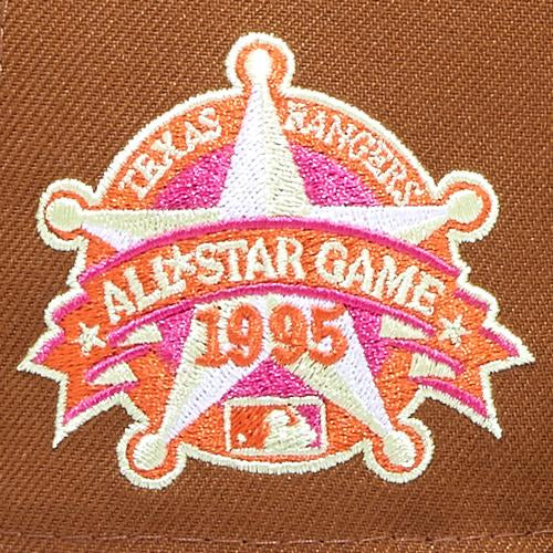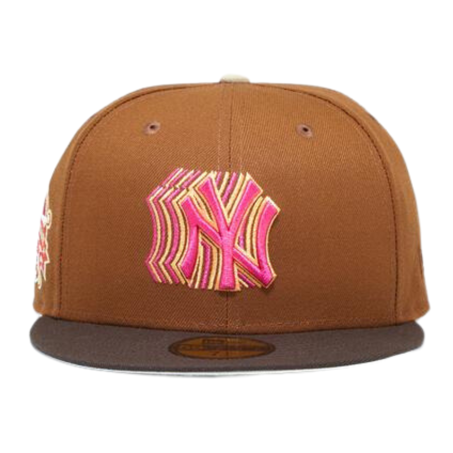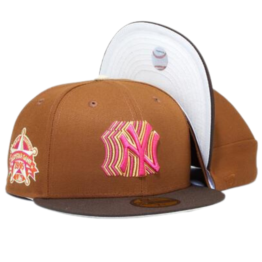 This New Era New York Yankees 59FIFTY fitted hat was released by Eblens. The fitted has a toasted peanut six panel structured high crown with walnut brown embroidered eyelets and a chrome fabric squatchee button. The flat bill of the fitted is walnut brown. The front panel features the NY Yankees logo embroidery with a 1995 All-Star Game side patch on the right panel.
