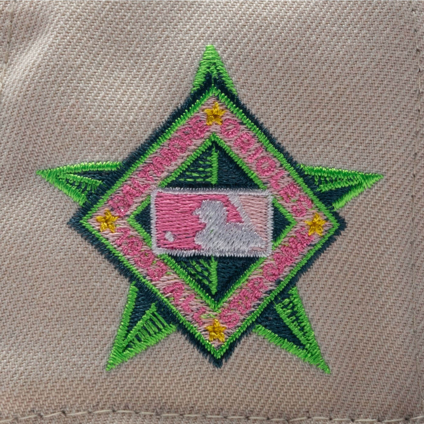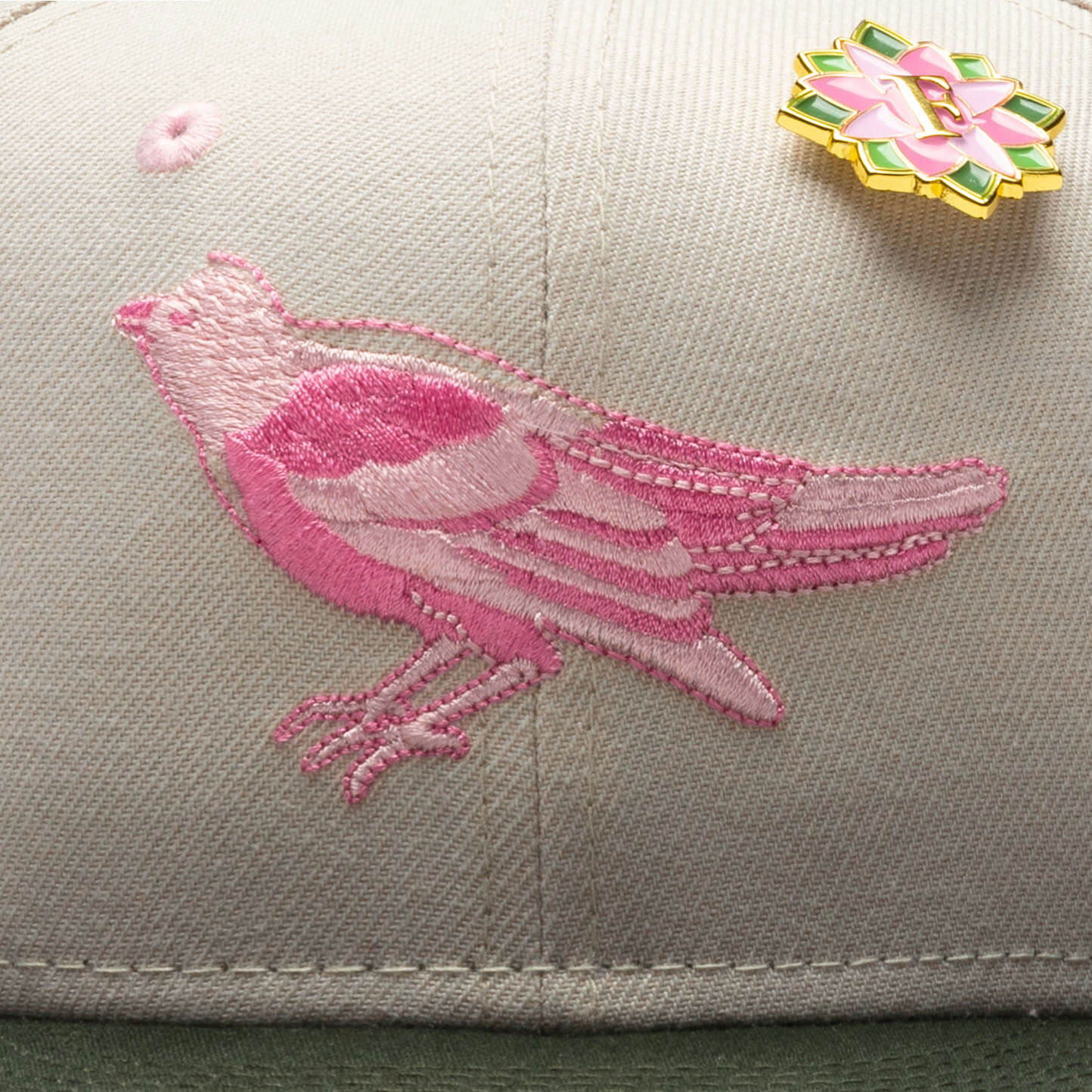 This Baltimore Orioles 59FIFTY fitted hat was released by Feature . The fitted has stone gray six panel structured high crown and embroidered eyelets, with a black flat brim and fabric squatchee button. The fitted also has a pink bottom undervisor and black sweatband. The front panel features the Baltimore Orioles logo embroidered in pink threads in similar shade of the lotus flower, with a 1993 All-Star Game side patch on the right panel. The left panel of the fitted displays the New Era logo and the official MLB Batterman embroidery on the rear crown.
