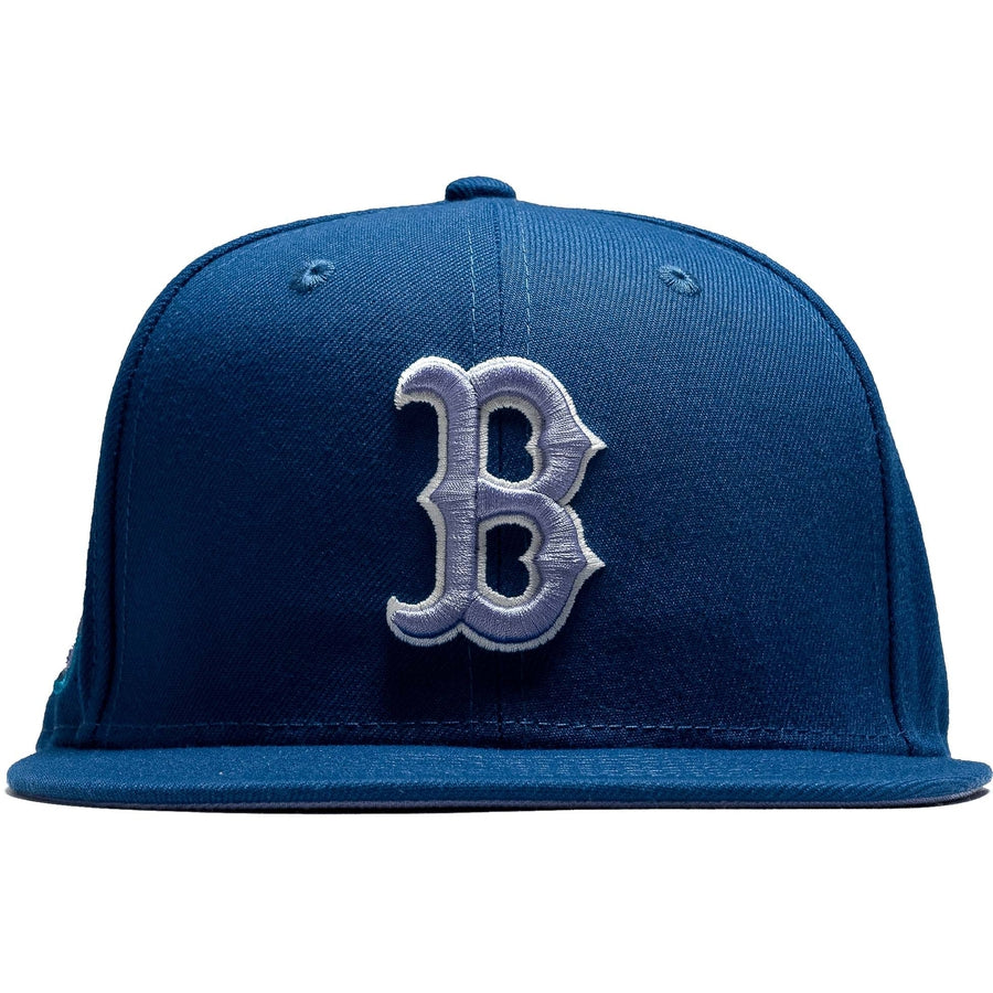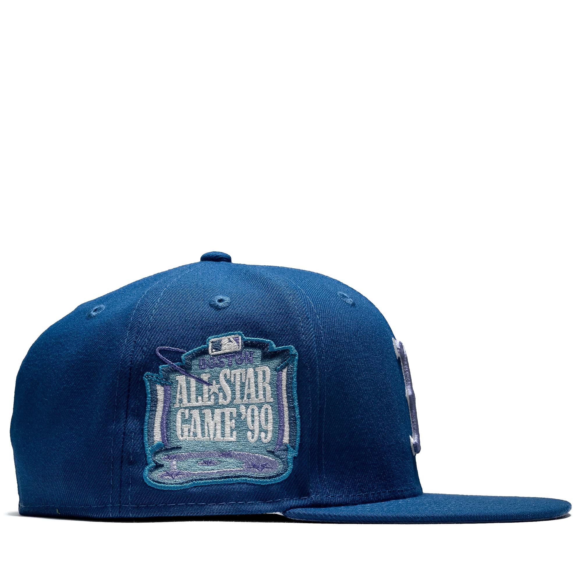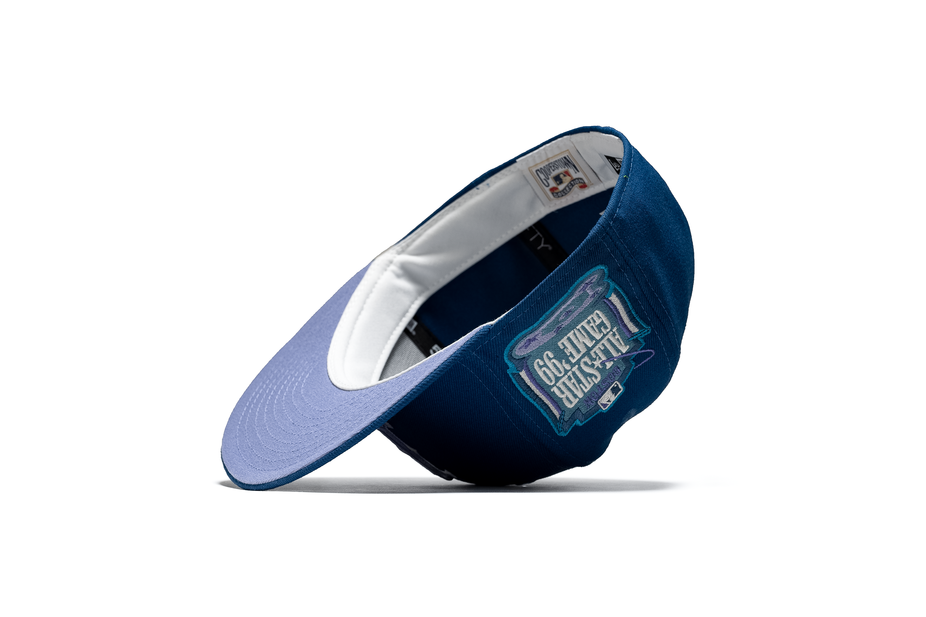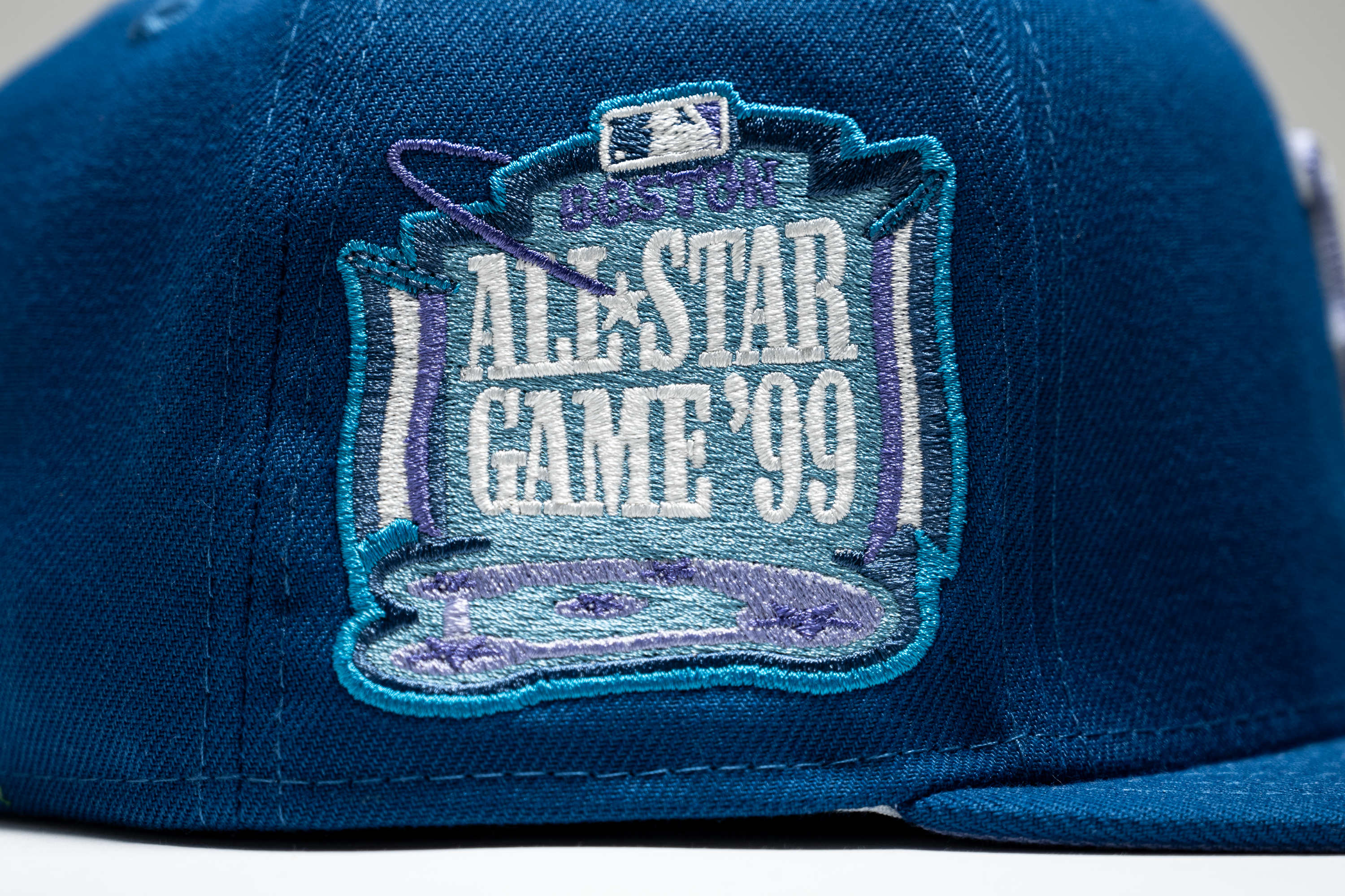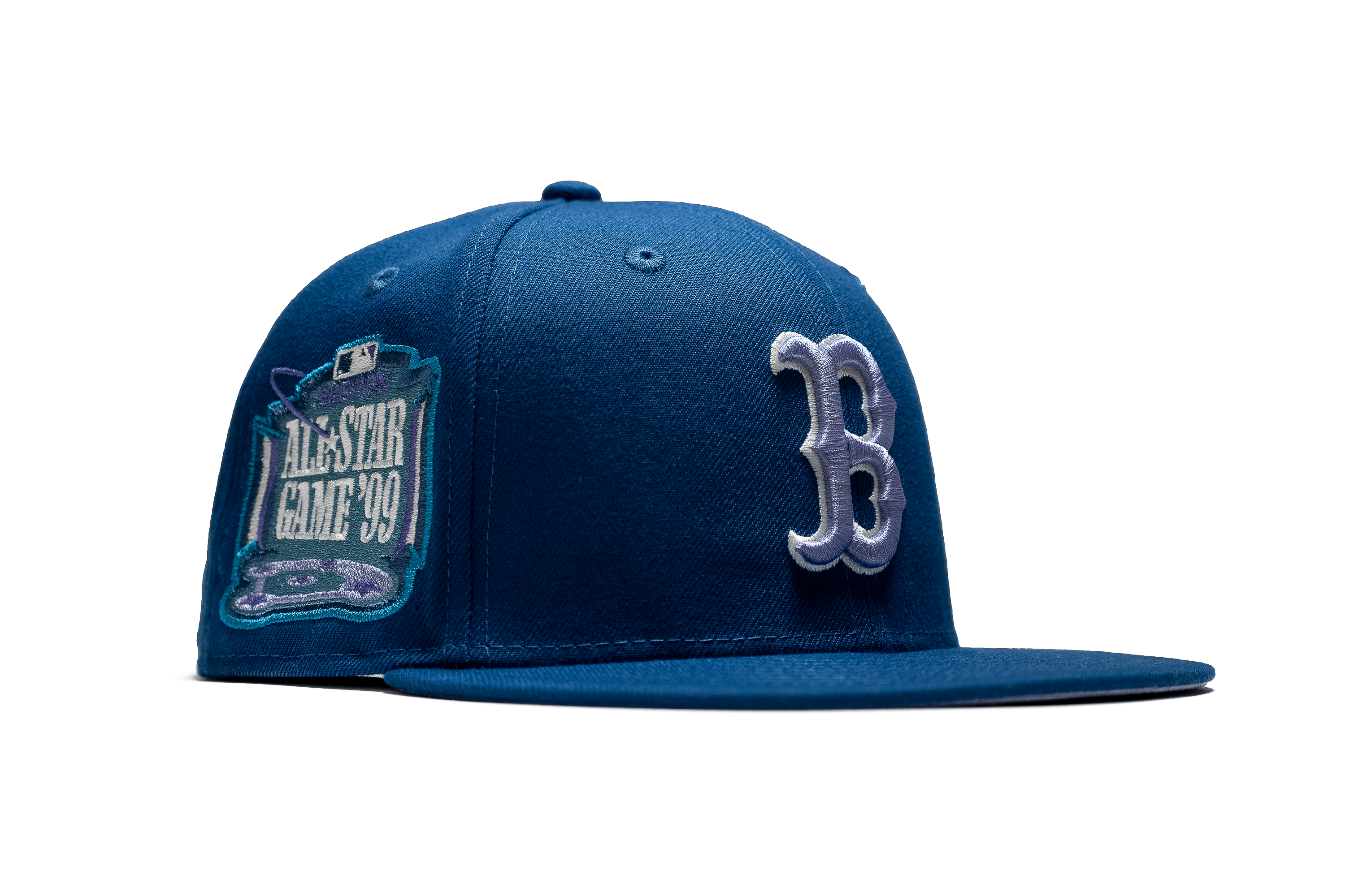 This New Era Boston Red Sox 59FIFTY fitted hat was released by Sneaker Politics. The fitted has a navy six panel structured high crown, embroidered eyelets, fabric squatchee button and flat bill. The front panel Boston Red Sox logo embroidery and the undervisor of the fitted cap has a lavender tone with a white sweatband. The right panel includes a 1999 All-Star Game side patch.