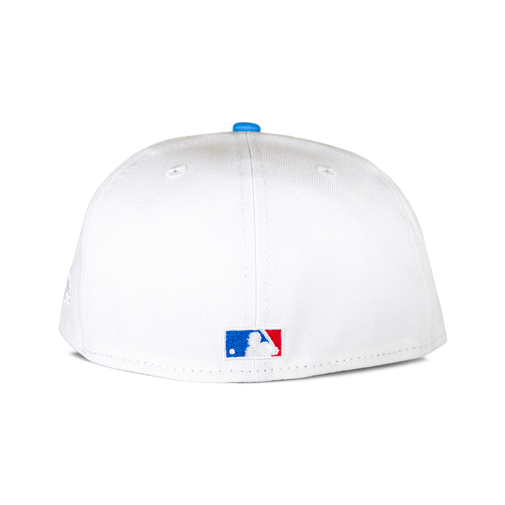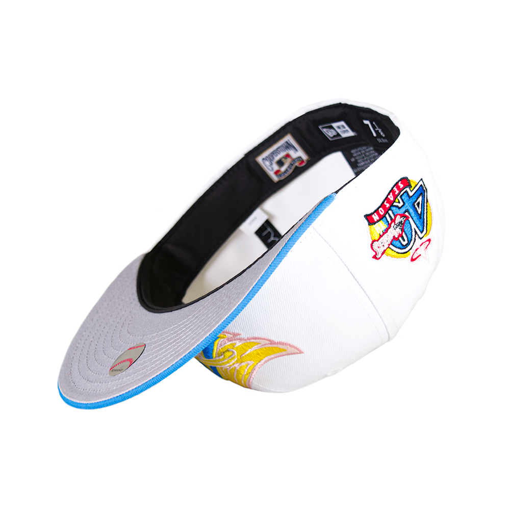 This Anaheim Angels 59FIFTY fitted hat was released by Capanova. The fitted has a white six panel structured high crown and embroidered eyelets with a blue fabric squatchee button. The fitted cap also has a blue flat bill with a grey undervisor and black sweatband. The front panel features the Anaheim Angels logo embroidery and a 40 Seasons side patch embroidery on the right panel. The left panel of the fitted displays the New Era logo and the official MLB logo embroidery on the rear crown.