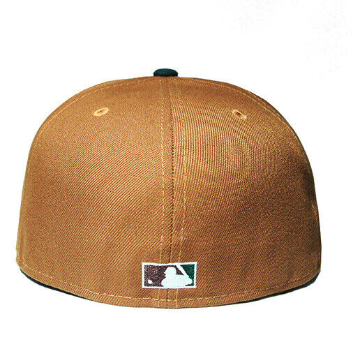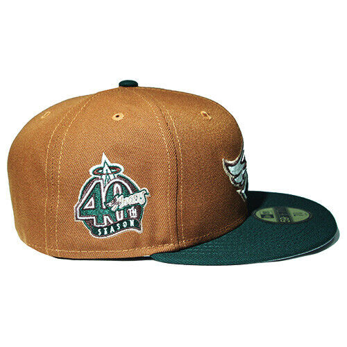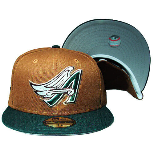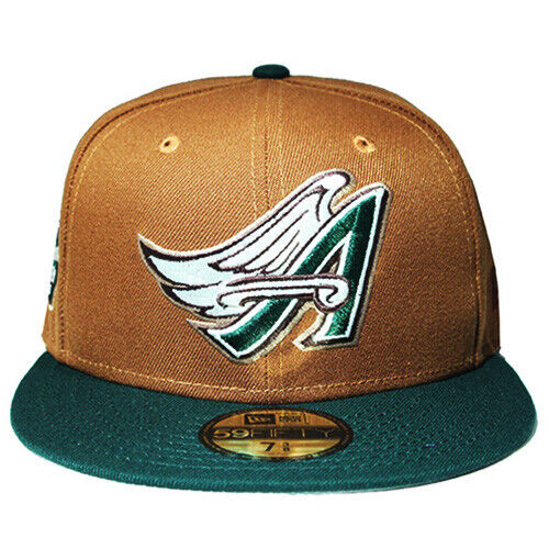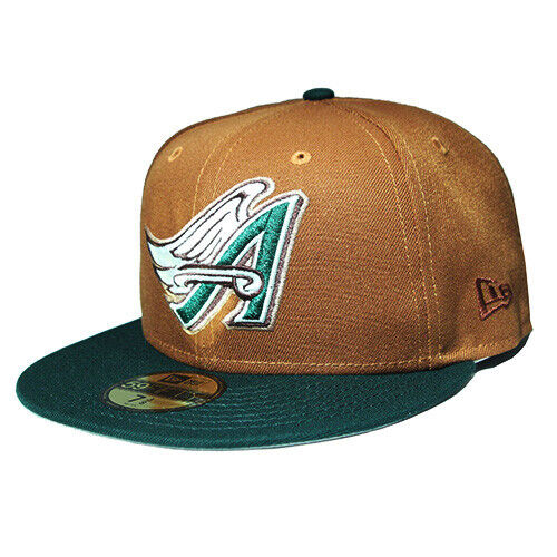 This New Era Anaheim Angels 59FIFTY fitted hat has a toasted peanut six panel structured high crown and embroidered eyelets with a pine green fabric squatchee button. The flat bill of the fitted is also pin green. The front panel features the Anahheim Angels logo embroidered in pine green and white stitching, a 40th Season side patch on the right panel and the official MLB batterman logo on the rear-crown.