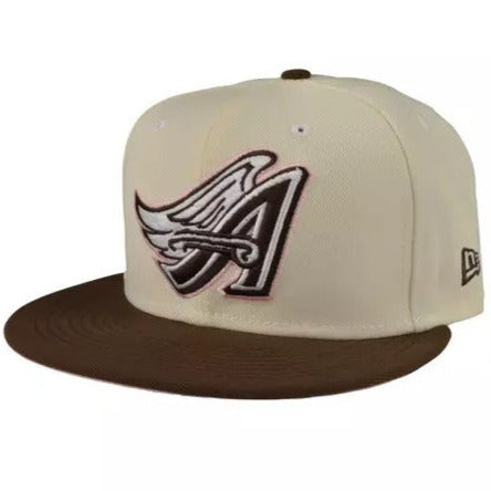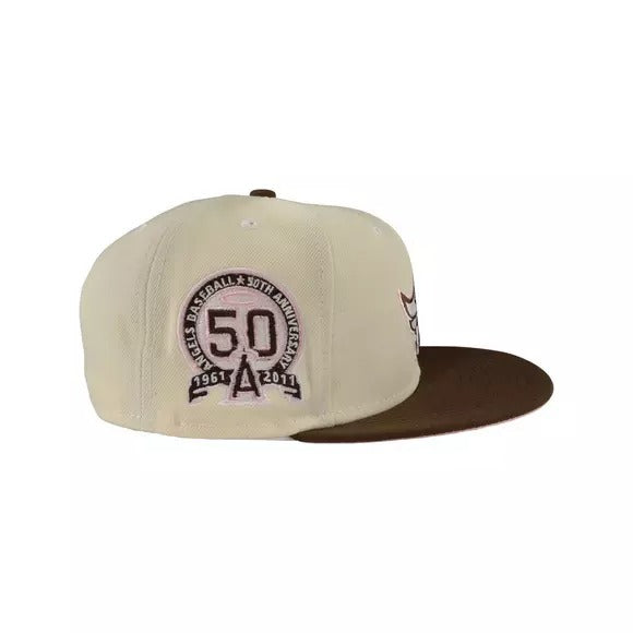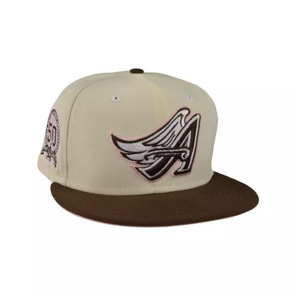 This New Era Anaheim Angels Ice Cream Dreams 59FIFTY fitted hat has a cream six panel structured high crown and embroidered eyelets with a mocha fabric squatchee button and flat bill with a pink undervisor and white sweatband. The front panel features the Anaheim Angels logo embroidered in mocha and pink stitching and a 50th Anniversary side patch.