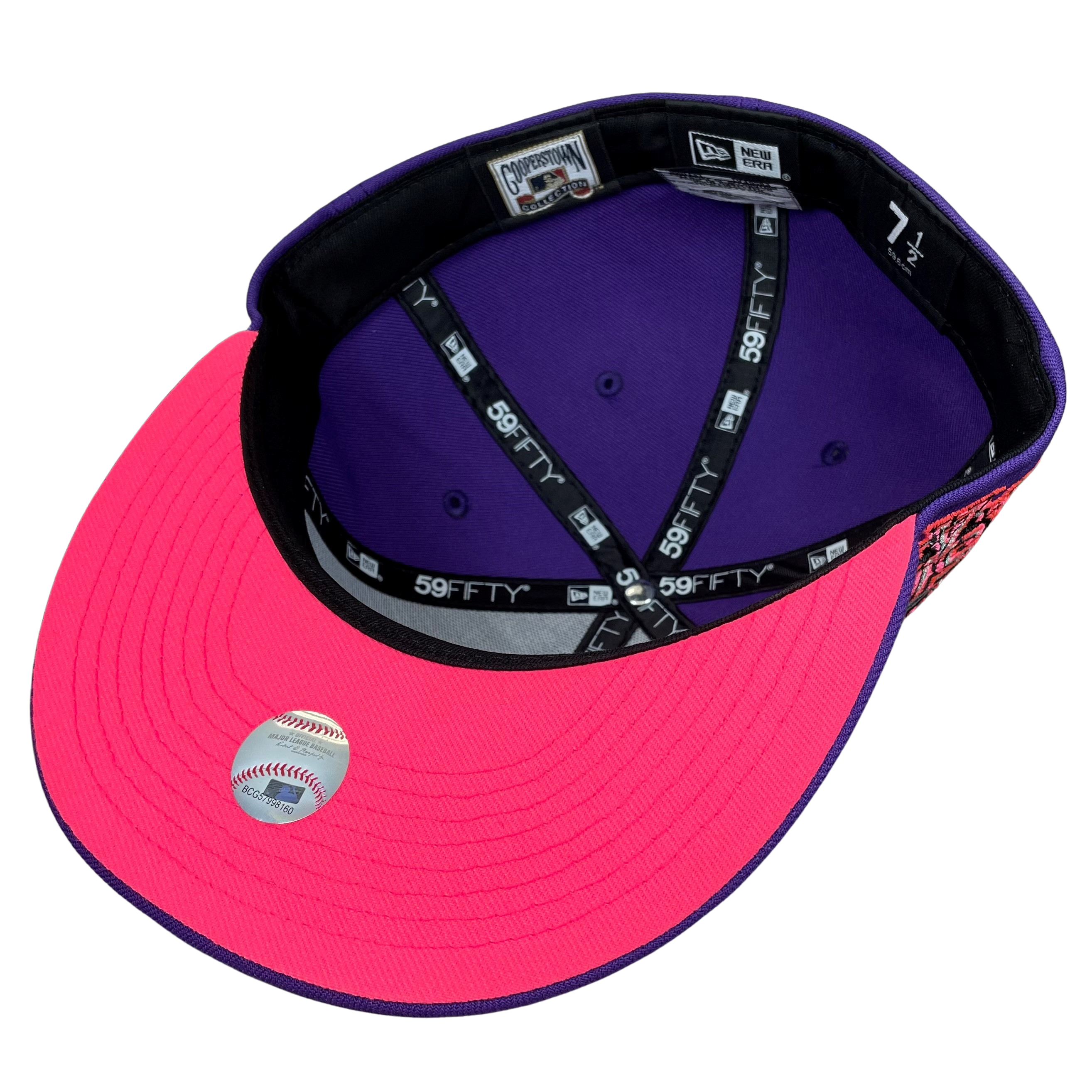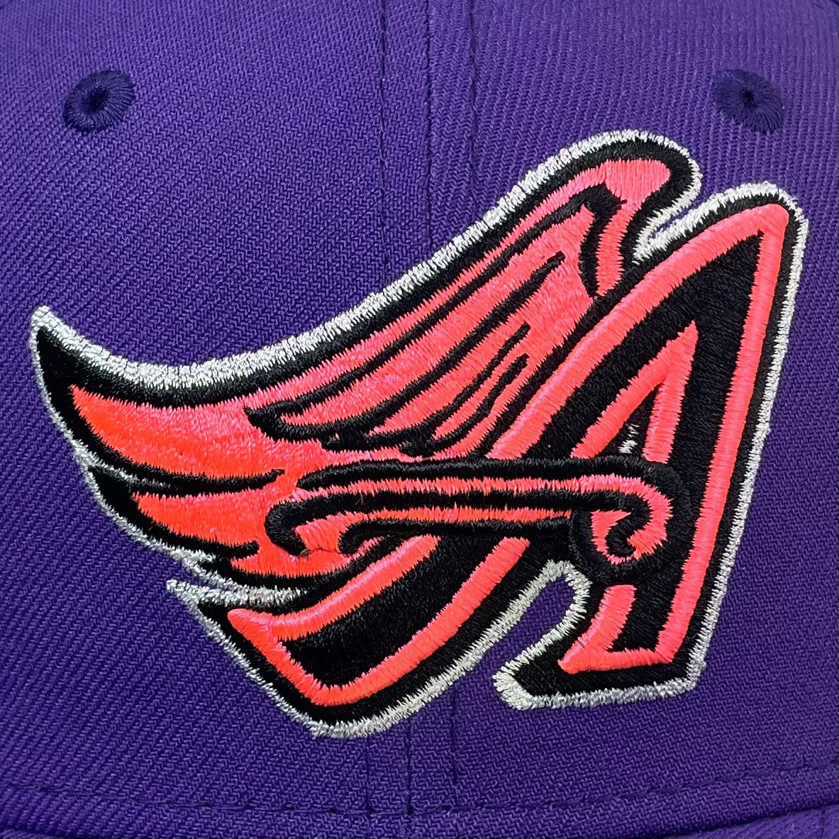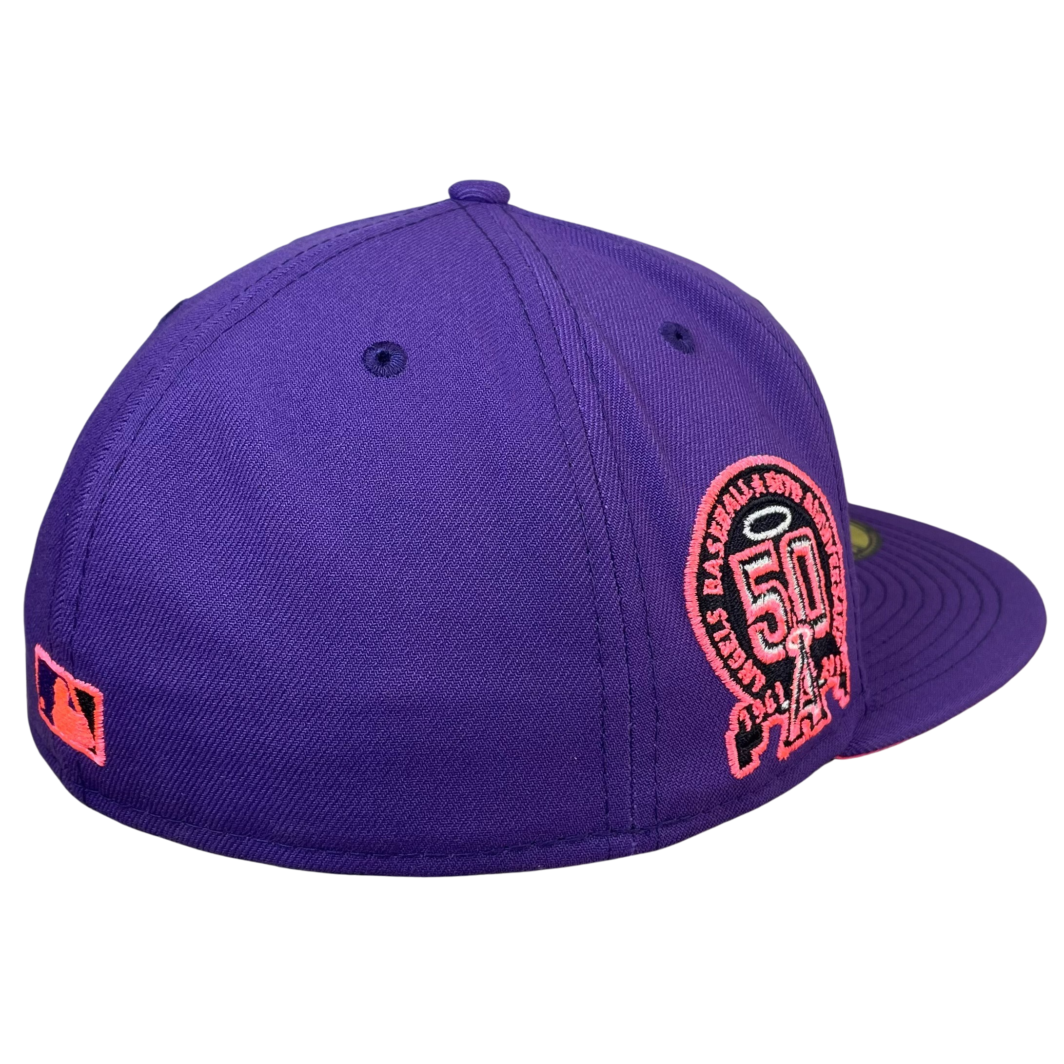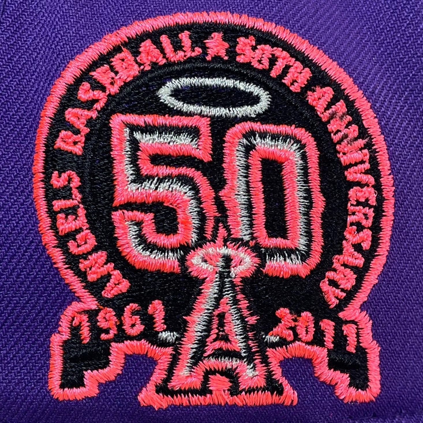 This New Era Los Angeles Angels Purple/Pink 50th Anniversary 59FIFTY Fitted Hat has a purple six panel structured high crown and embroidered eyelets with a purple fabric squatchee button. The fitted cap has a purple flat bill with a hot pink undervisor. The front panel features the Anaheim Angels logo embroidery and a 50th Anniversary side patch embroidery on the right panel. The left panel of the fitted displays the New Era logo and the official MLB logo embroidery on the rear crown.