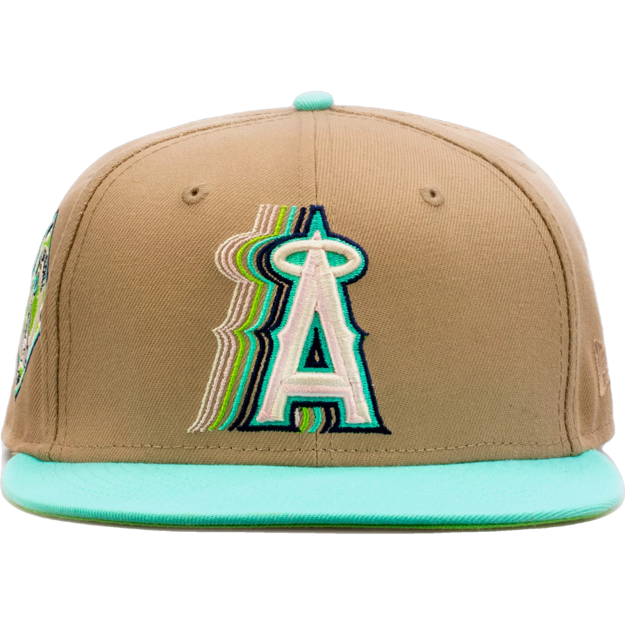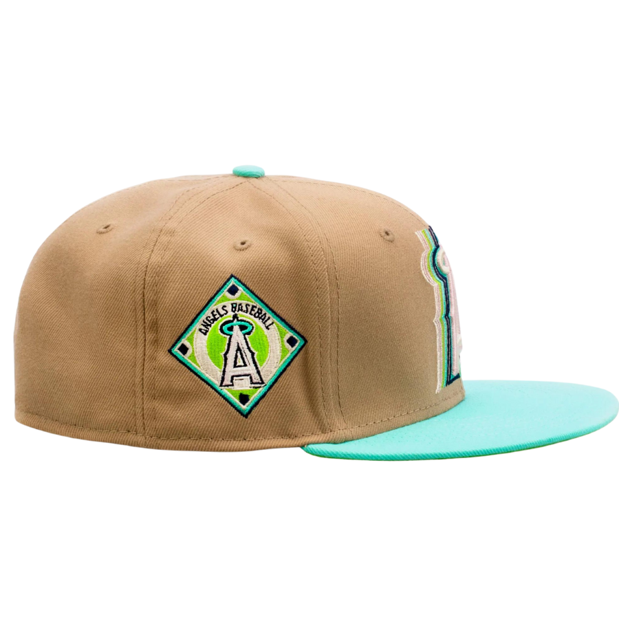 This New Era x Shoe Palace Anaheim Angels 'Winter Wonderland' Beige/Mint 2023 59FIFTY Fitted Hat was released by Shoe Palace. The fitted has a beige six panel structured high crown and embroidered eyelets with a mint fabric squatchee button and flat bill. The fitted cap has an lime green