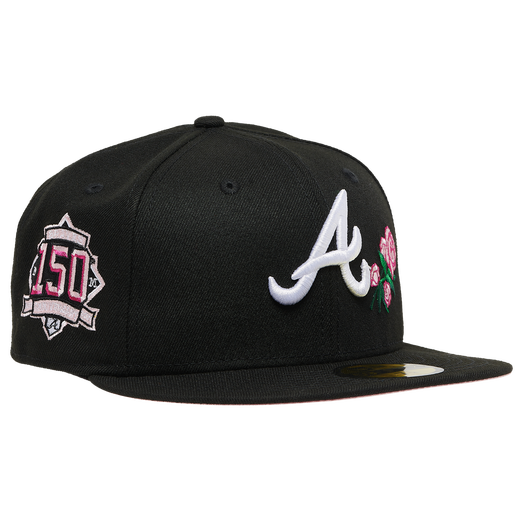 This New Era Atlanta Braves fitted hat has a black six panel structured high crown, embroidered eyelets, fabric squatchee button and flat bill. The undervisor of the fitted cap is pink with a black sweatband. The front panel features the Atlanta Braves logo embroidered in white thread with a pink rose embroidered patch. The right panel features a 150th Anniversary side patch embroidery.