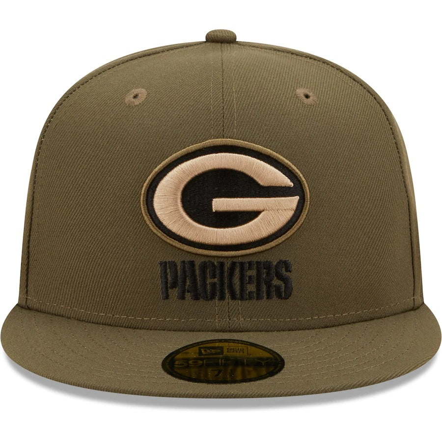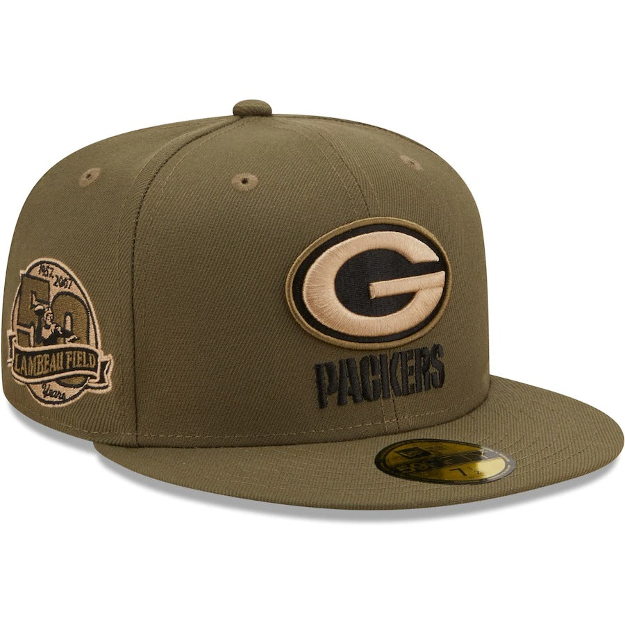 New Era Green Bay Packers Olive Lambeau Field 50th Anniversary Camo Undervisor 59FIFTY Fitted Hat