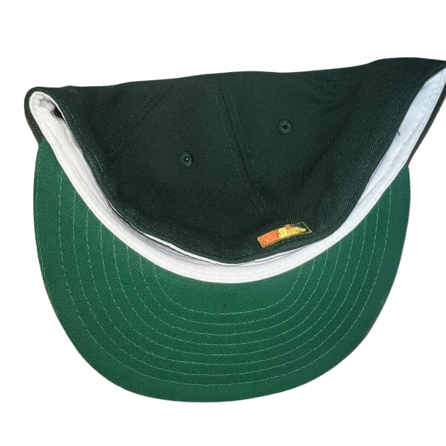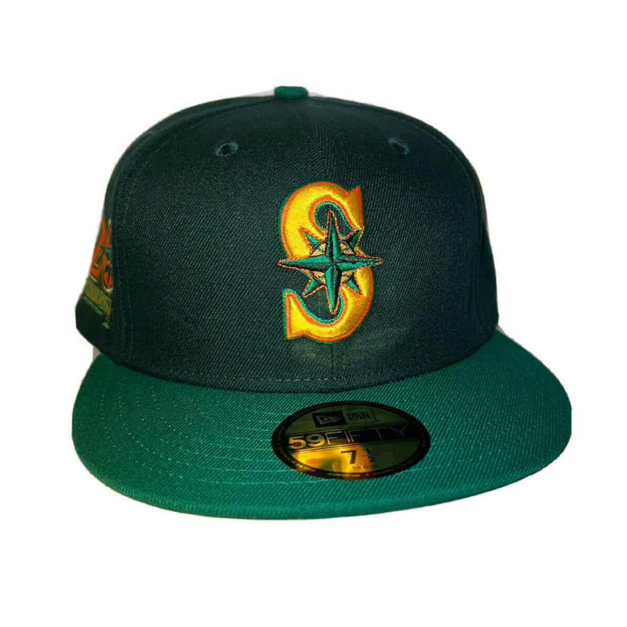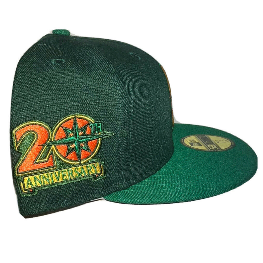 Upper Deck 20th Anniversary 59FIFTY fitted hat is a My Fitteds exclusive. The six panel structured high crown and embroidered eyelets are a dark green. The fabric squatchee button, flat bill and undervisor of the fitted cap is kelly green with a white sweatband. The front panel features the Seattle Mariners logo embroidered in yellow and green threads with an orange and green colorway 20th Anniversary side patch embroidery.