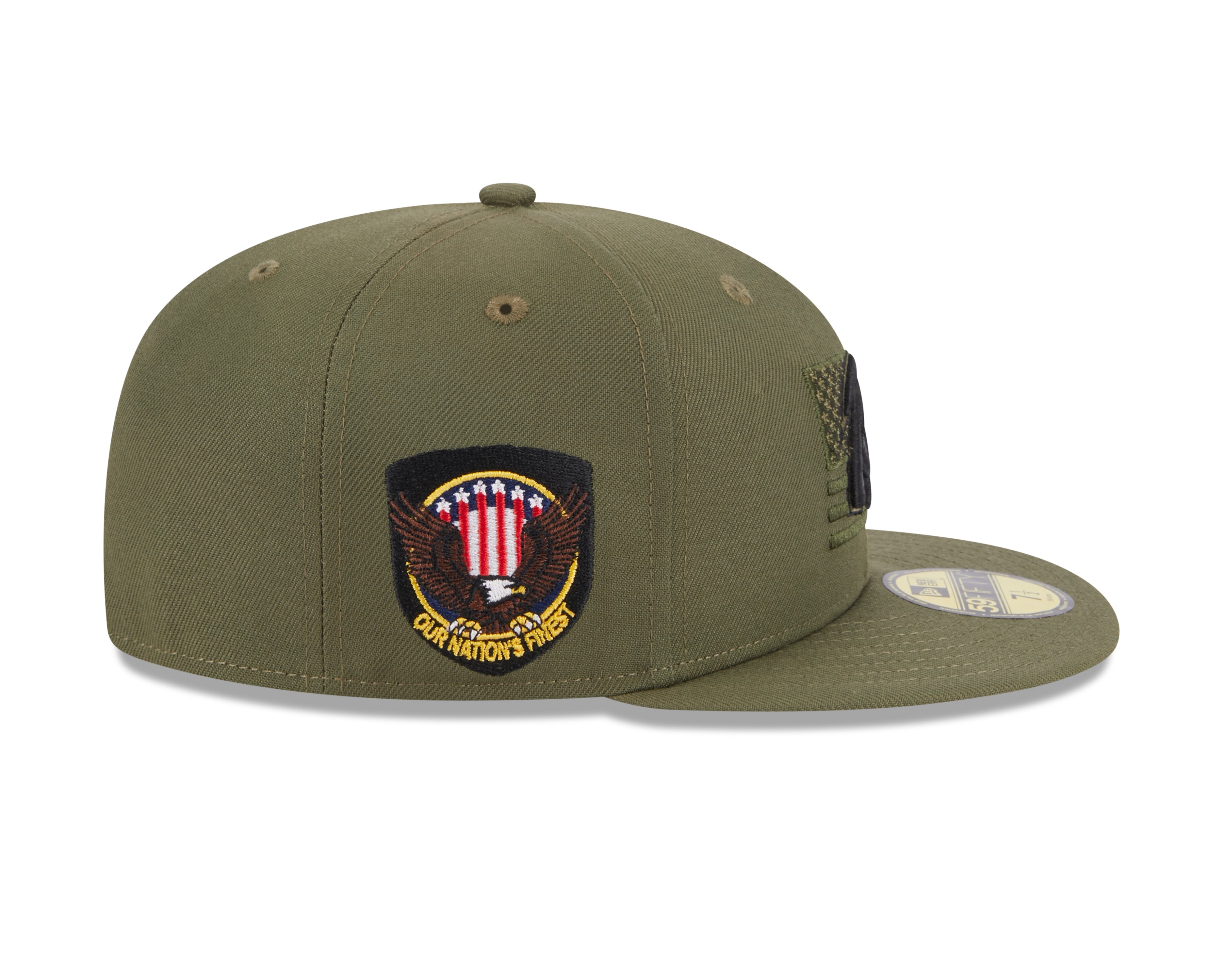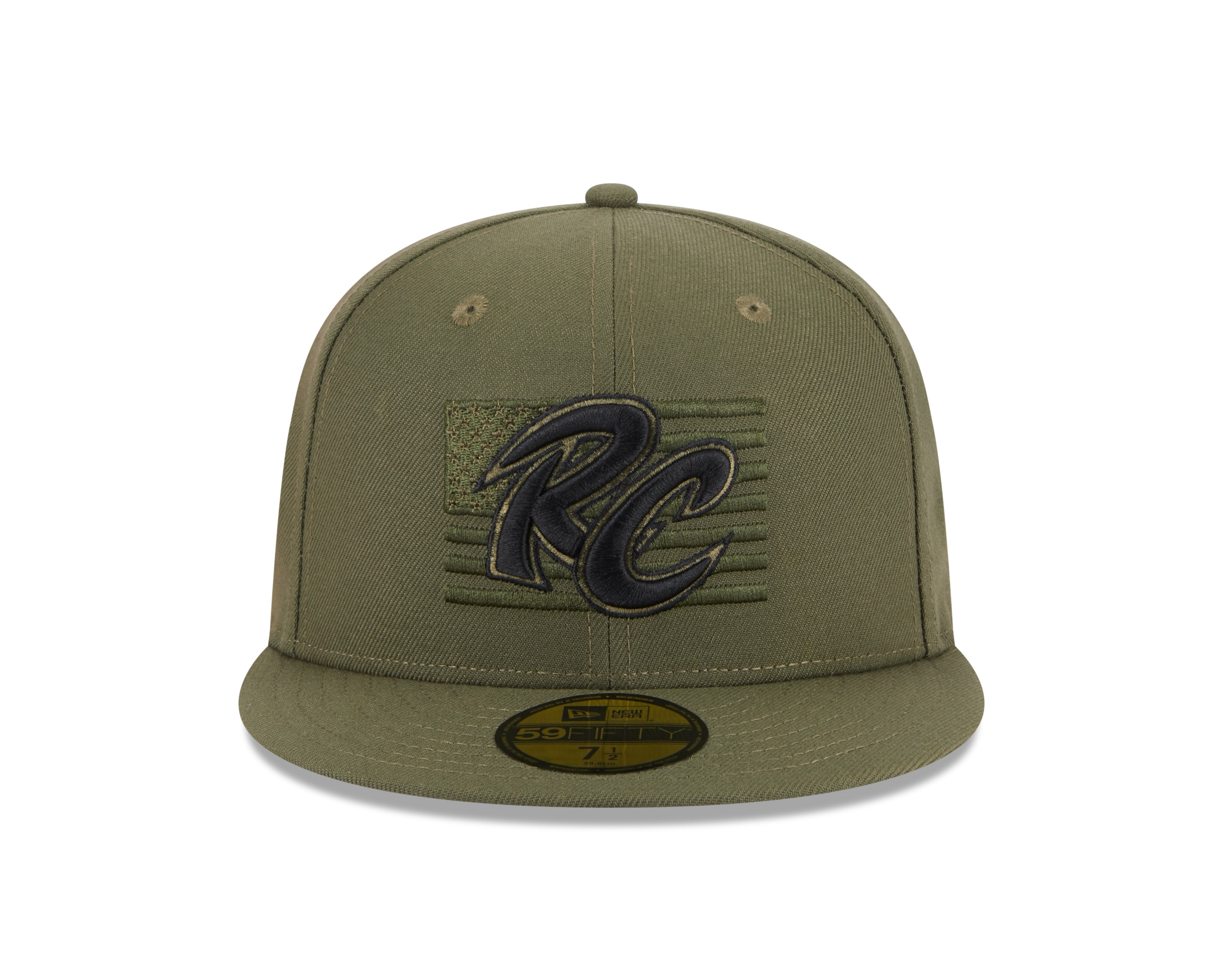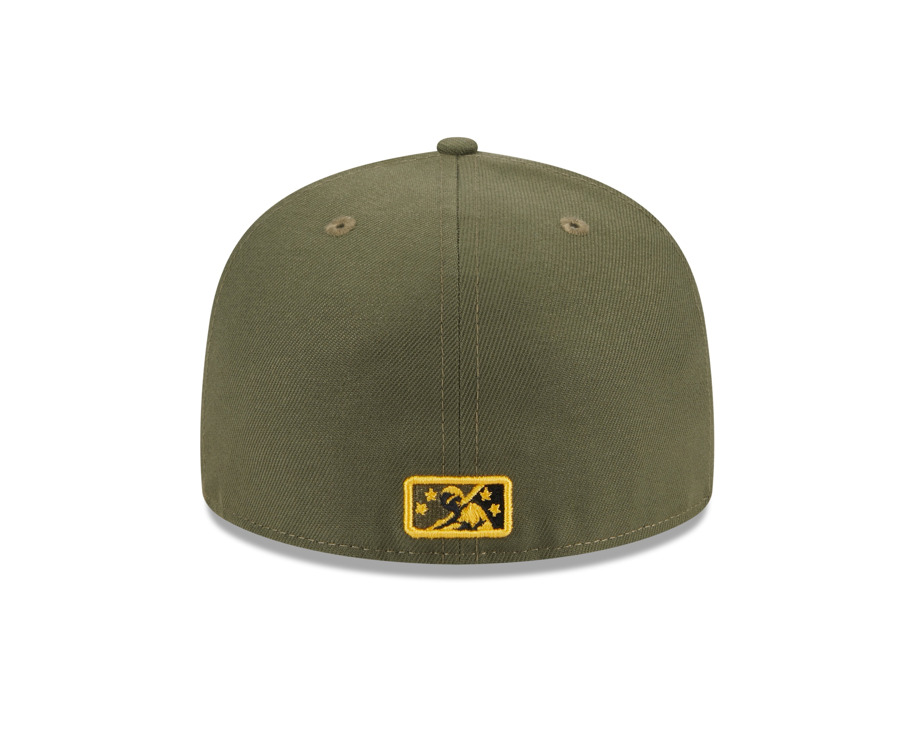 This Sacramento River Cats 59FIFTY fitted hat was released by MiLB Store. The fitted has a military green six panel structured high crown, embroidered eyelets and fabric squatchee button. The fitted cap also has a military green flat bill. The front panel features the Sacramento River Cats logo embroidery and a "Our Nations Finest" side patch embroidery on the right panel. The left panel of the fitted displays the New Era logo and the official MiLB Batterman logo embroidery on the rear crown.