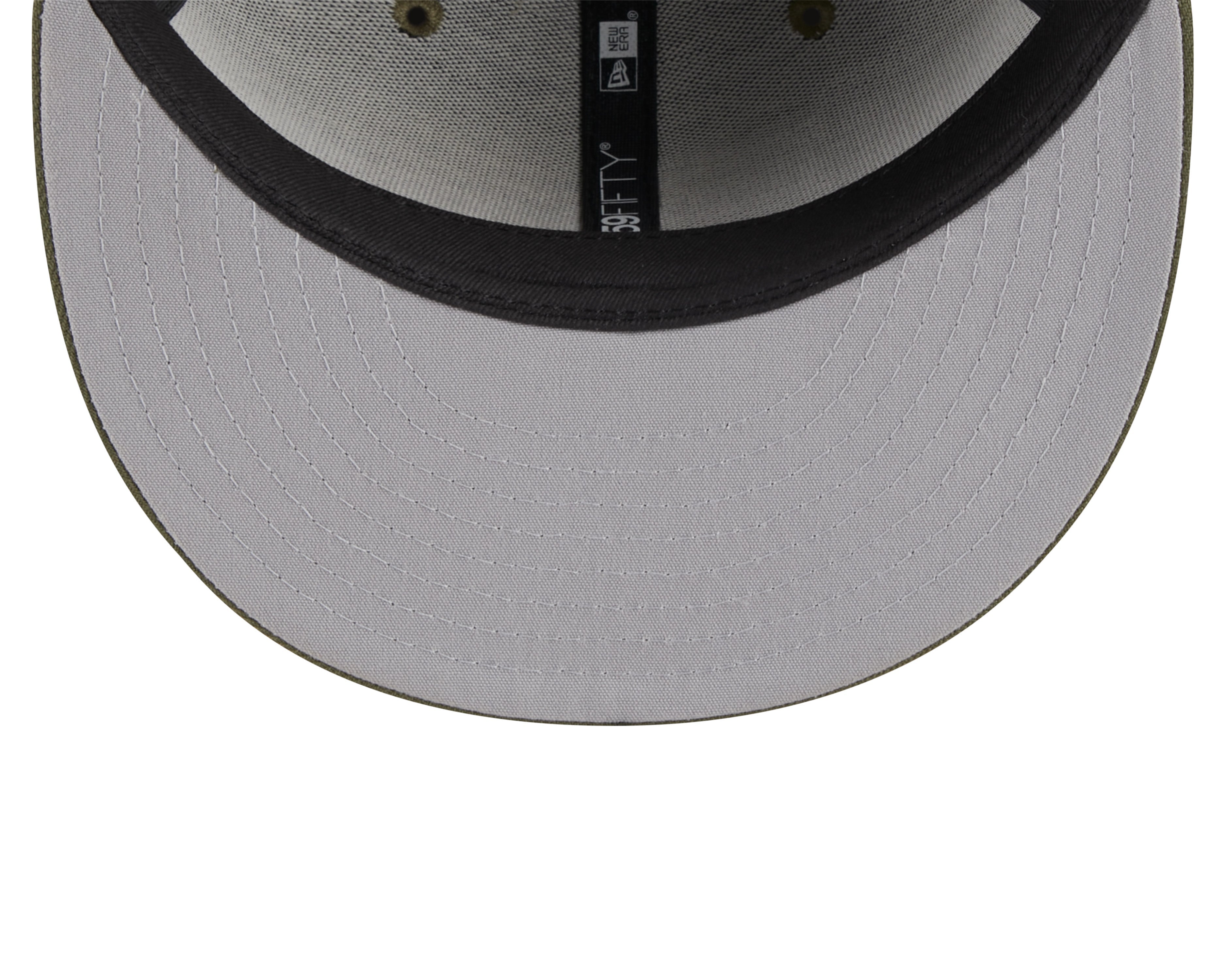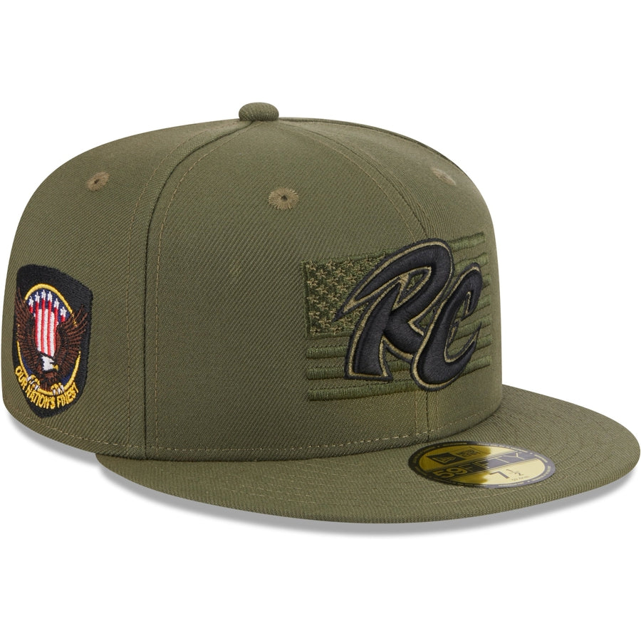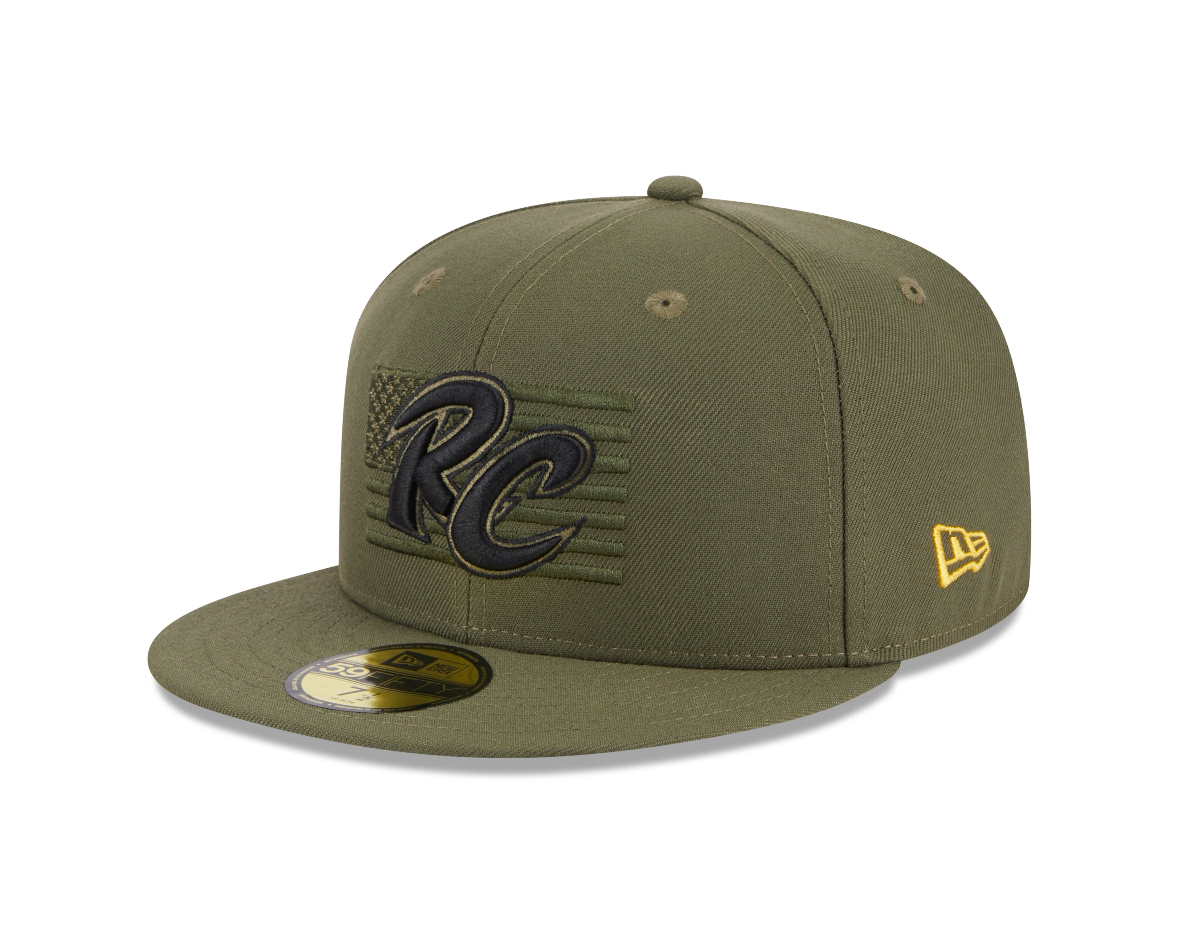 This Sacramento River Cats 59FIFTY fitted hat was released by MiLB Store. The fitted has a military green six panel structured high crown, embroidered eyelets and fabric squatchee button. The fitted cap also has a military green flat bill. The front panel features the Sacramento River Cats logo embroidery and a "Our Nations Finest" side patch embroidery on the right panel. The left panel of the fitted displays the New Era logo and the official MiLB Batterman logo embroidery on the rear crown.
